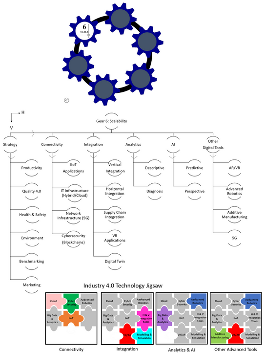 Figure 12. Gear 6—scalability stage and Industry 4.0 technology jigsaws (primary technologies represented in colour, secondary technologies represented in grey).