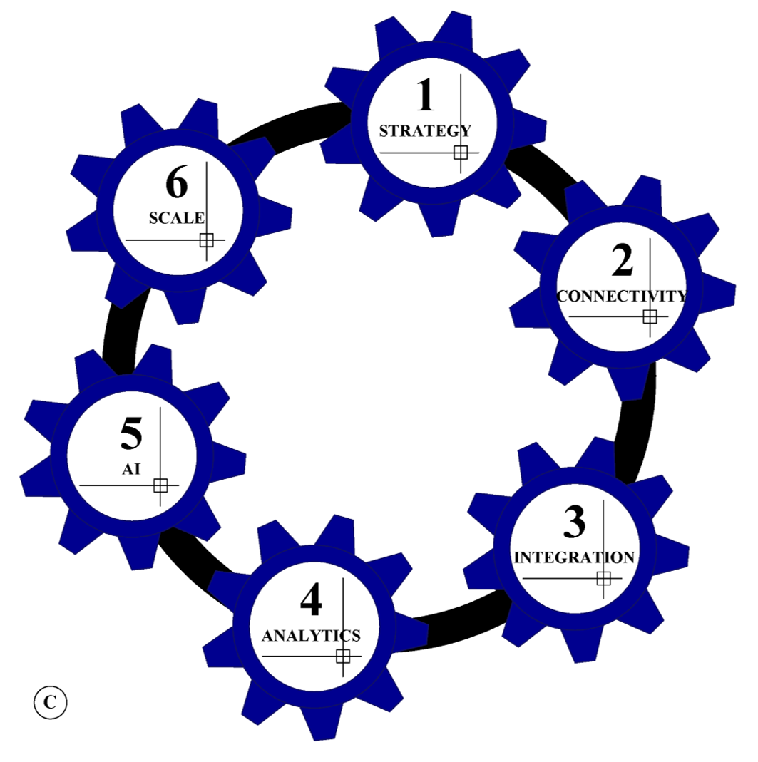 The first gear of the roadmap is the strategy stage which discusses the strategy to build for the adoption journey. The second gear is the connectivity stage which identifies ways to build the foundations for the connectivity infrastructure. The third gear is the integration stage which discusses system integration strategies between information and operation technologies. The fourth and fifth gears are the Analytics and AI stages that highlights the analytical tools and methods that can be used to capitalize on the data turning it into actionable information. The last gear is the Scale stage which outlines different possible approaches that can be adopted to scale, optimize and continue the development of the different stages of the roadmap throughout the Industry 4.0 journey.