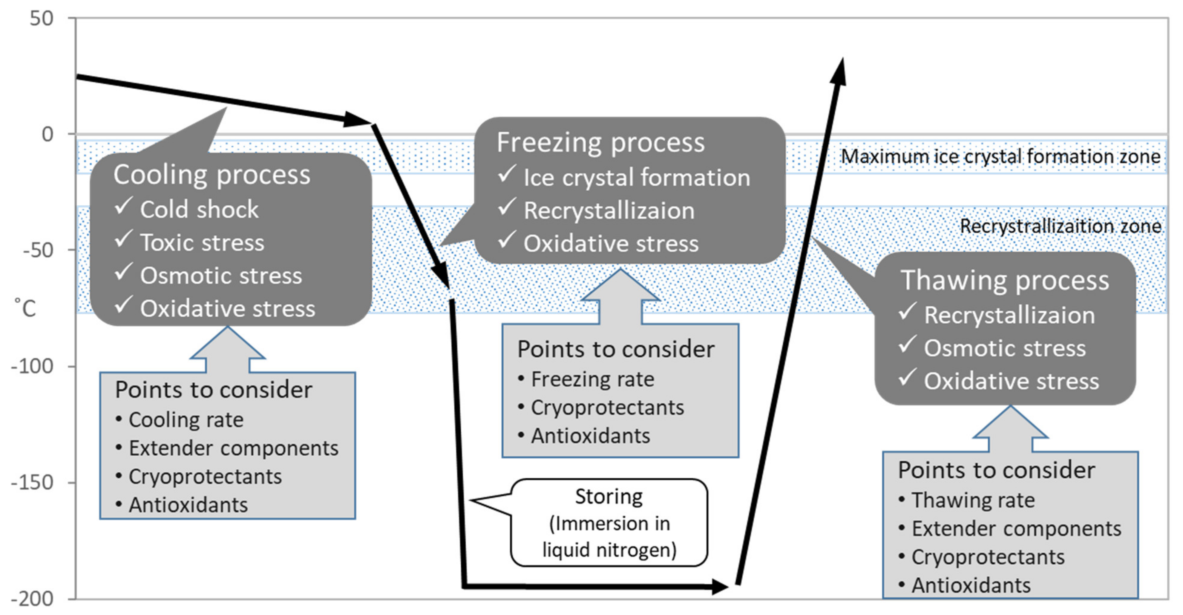 As mentioned above, the successful preservation of rabbits depends on the efficiency and reliability of procedures in sperm cryopreservation. It is known that the process of sperm cryopreservation, including cooling, freezing and thawing, leads to cellular damage on membrane, cytoplasm and genome structures [10][11] caused by osmotic stress, cold shock, intracellular ice crystal formation, and excessive production of reactive oxygen species (ROS) [12] (Figure 2). During the cooling process, the sperm membrane is injured by cold shock which can be diminished by cooling rate [13] or materials stabilizing the membrane including egg yolk or skim milk [14]. The addition of cryoprotectants causes osmotic and toxic stress, which increases due to prolonged exposure during slow cooling [15]. In the following freezing process, major problem is ice crystal formation which grows larger by recrystallization and injures cell [16]. The freezing rate and cryoprotectants application should be considered to diminish the problem. Recrystallization occurs during the thawing process because of entry through the recrystallization temperature zone. Since sperms suffer from oxidative stress throughout the cryopreservation process [12], supplementation of antioxidants is considerable for the improvement of sperm quality.
