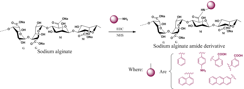 facilitate cell imaging. Alginate derivatives are also used for preparation of plastic materials with tunable organosolubility and thermal properties [89-91]. Catalytic hydrogenation of the polysaccharide leads to sugar alcohols that may provide opportunities to diversify biomass resources [92]. Alginic acid can be chemically modified by attaching various moieties at the end of the carboxylic acid group of guluronic acid (G) or mannuronic acid (M). The obtained derivatives were characterized thoroughly using various analytical tools. Usually, the sodium salt of alginic acid was used for the modification because of the good solubility of sodium alginate in water. Most of the reactions were done under microwave irradiation for improved yield and to shorten the time duration. The modification reactions involved esterification and amidation. (Figure 4) These modified alginic acids have new properties and has the potential to be used in fluorogenic metal scavenging [93,94], thixotropic material [95,96], efficient photosensitizing material [97], etc.