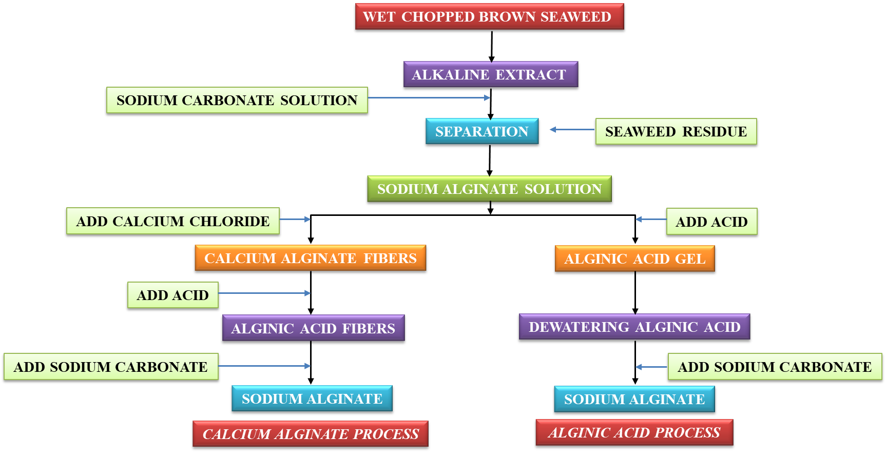 The brown seaweeds are one of the most abundant seaweeds found in many parts of the world. The giant kelp Macrocystis pyrifera is harvested mechanically using special ships on the west coast of North America. These seaweeds have very high growth rate and hence they can be harvested several times a year. Other species of the brown seaweeds which are relatively smaller in size in comparison to Macrocystis spp. are harvested semi-mechanically using fishing boats or manually. Several brown seaweeds such as Ascophyllum, Laminaria, Macrocystis, and Sargassum species are used for the extraction of sodium alginate employing calcium alginate and/or alginic acid processes as shown in Scheme 2.
