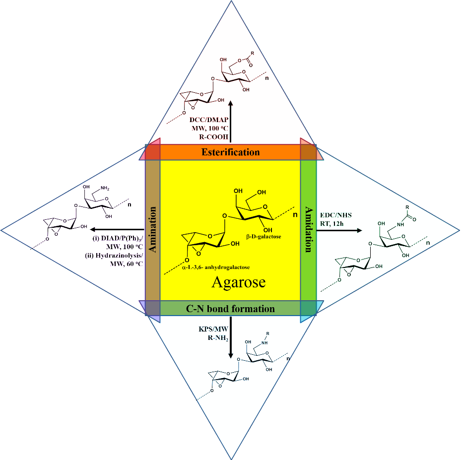 Agarose was modified by substituting a new functional group in the primary alcohol group at their C-6 carbon of (1,3) linked β-D-galactose moiety. The derivatives thus obtained were characterized thoroughly using competent analytical tools. Usually, organic and aqueous solvents were used for the modification. In organic solvents, DMF and DMSO were used for the reactions. Most of the reactions were done under microwave irradiation for improved yield and to shorten the time durations. The modification reactions involved esterification [49, 52], amination [56], amidation reactions [56], -C-N- bond formation [53–55,57] etc. (Figure 2) These modified agarose derivatives have new functional properties such as enhanced fluorescence emission, sweetness properties, cationic properties for gene/drug delivery, ability to form fluorescence hydrogel and highly stable hydrogel formation stable in different pH solution, self-assembled nanoparticles etc.