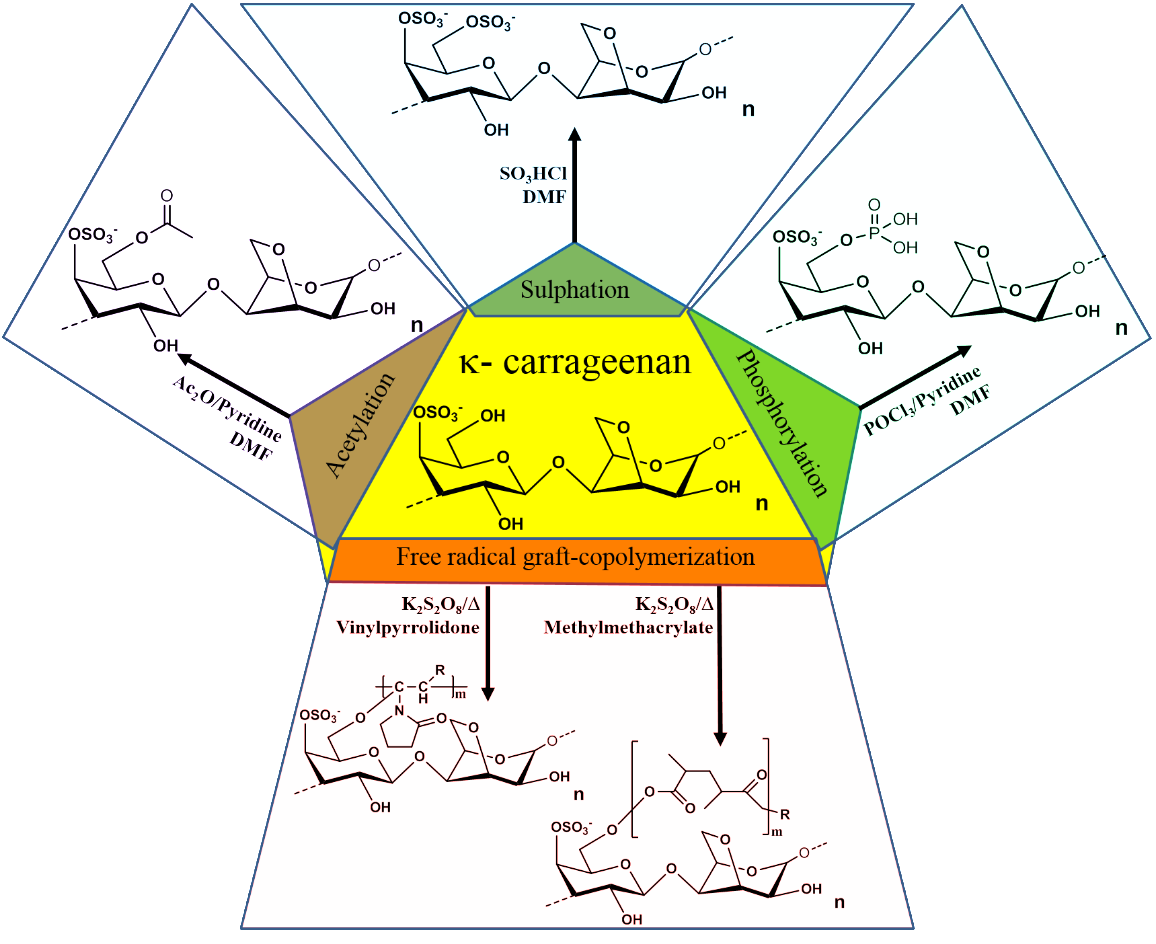 Numerous chemical modifications have been proposed to modify the physicochemical properties of carrageenan. Most of the modifications aim to induce new properties by substituting the primary alcohol group present in the D-galactose-4-sulphate moiety of the biopolymer with a new functional group. The modification reactions involve free radical graft-copolymerization, sulphation, acetylation, and phosphorylation [82–84]. (Figure 3) All of the carrageenan derivatives have new functional properties such as improved absorptivity, gel strength, mechanical, magnetic, rheological, water-holding capacity, swelling properties, antioxidant activity, biodegradability, stability in different pH region, storage and thermal stability of the enzymes upon encapsulation etc. which broaden the application area of the polysaccharides [85].