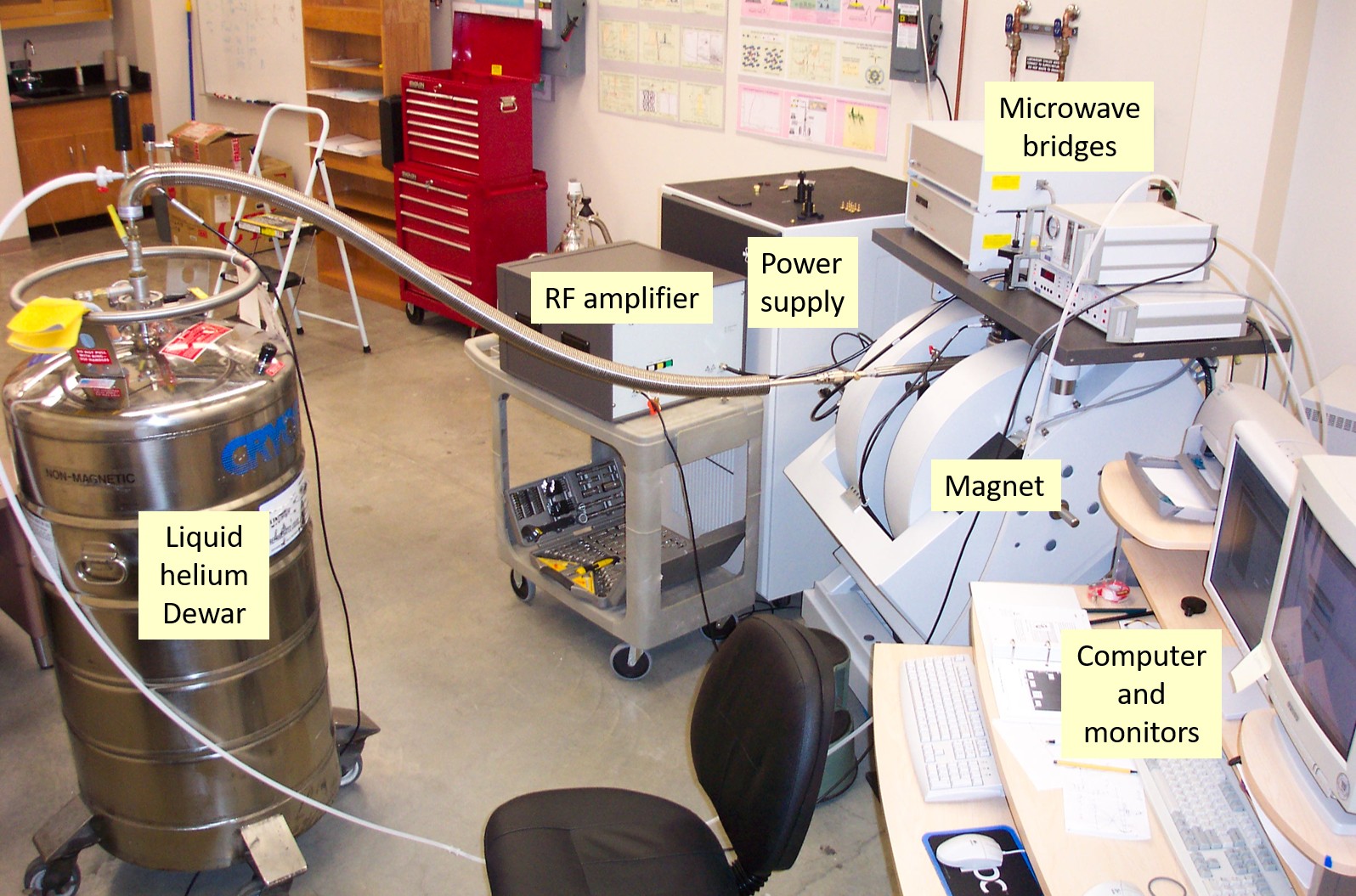 A variety of scientific, industrial and educational tasks demands various equipment for their solution. The simplest bench top spectrometers, which use compact permanent magnets and microwave frequencies 1÷10 GHz, are suitable for dosimetry, food analysis, life science, and education. Spectrometers with electromagnets for magnetic fields 0÷2.5 T and resonance cavities for 1÷75 GHz are successfully applied for many research problems in physics, chemistry, geology, and mineralogy (Fig. 10). Higher magnetic fields are required to resolve radicals with overlapping lines due to close values of g-factors. Superconducting magnets with fields about 3÷12 T together with sources of 100÷300 GHz photons are used for biology, biochemistry, biophysics and medical research. Advanced spectrometers are equipped with cryogenics and heaters for investigations in a broad range of temperatures from 1.2 to 1000 K. Modern spectrometers are partly or fully computerized. This significantly simplifies and accelerates measurements, facilitates spectrum treatment and interpretation allowing to obtain desirable results in days and weeks instead of months and years for old equipment.