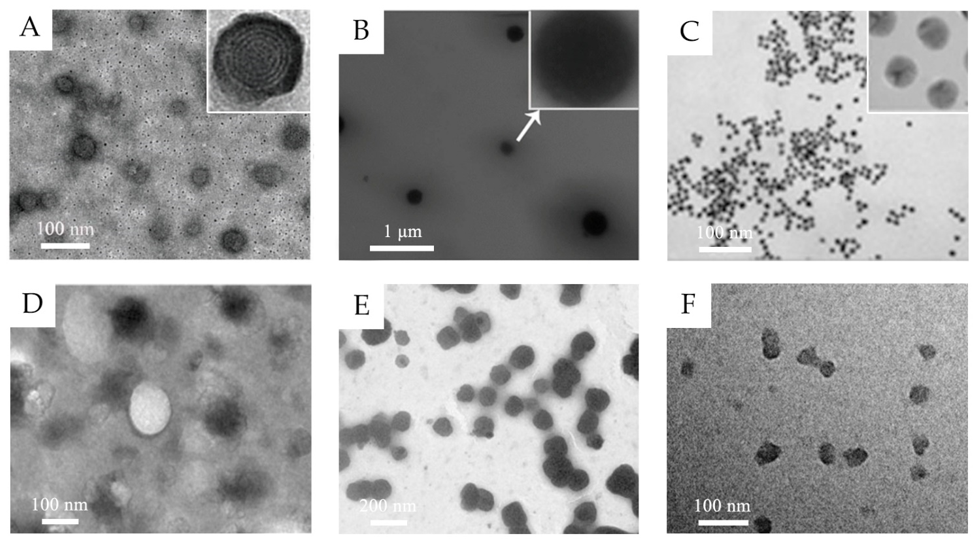Figure 1. (A) TEM images of 5-aminolevulinic acid-loaded ethosomal vesicles. Adapted from Reference [8] with permission of The Royal Society of Chemistry. (B) TEM images of triptolide-loaded nanostructured lipid carriers (NLC). Adapted from Reference [11] with permission. (C) TEM images of the citrate-capped gold nanoparticles. Adapted from Reference [12] with permission. Copyright (2017) American Chemical Society. (D) TEM images of silk fibroin nanoparticles. Reproduced from Reference [13] Copyright (2018), with permission from Elsevier. (E) TEM images of water-in-oil (w/o) nanoemulsions of caffeine. Reproduced from Reference [14]. Copyright (2010), with permission from Elsevier. (F) TEM images of hyaluronic acid nanogels. Reproduced from Reference [15]. Copyright (2015), with permission from Elsevier.