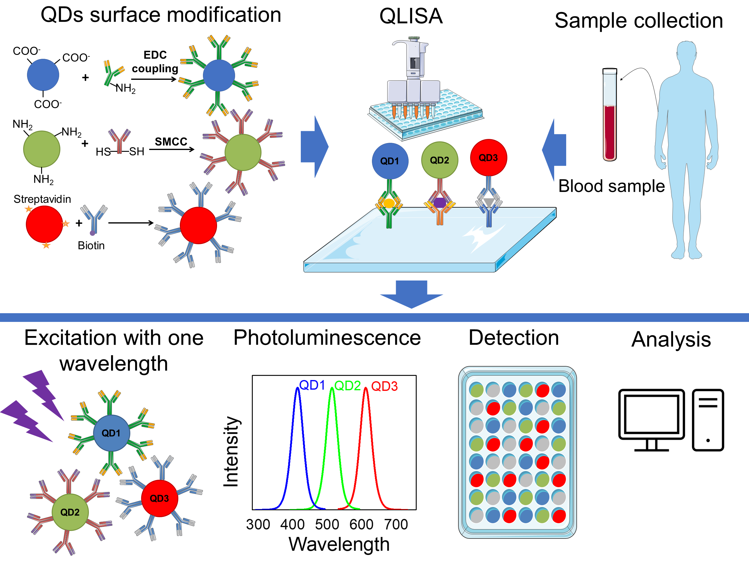 Multiplexed diagnostics using quantum dot-linked immunosorbent assay (QLISA). Firstly, the surface of the quantum dots (QDs) is modified with specific antibodies using 1-Ethyl-3-(3-dimethylaminopropyl)carbodiimide (EDC) coupling, succinimidyl-4-(N-maleimidomethyl) cyclohexane-1-carboxylate (SMCC) conjugation, or streptavidin–biotin interaction. Clinical samples from patients are processed and loaded to a QLISA plate, which is coated with capture antibodies. Then, modified QDs are loaded and the plate is scanned using a microplate reader. Different QDs in the sample are excited with the same wavelength and several bands of photoluminescence are detected. The final step is the analysis of the acquired data.