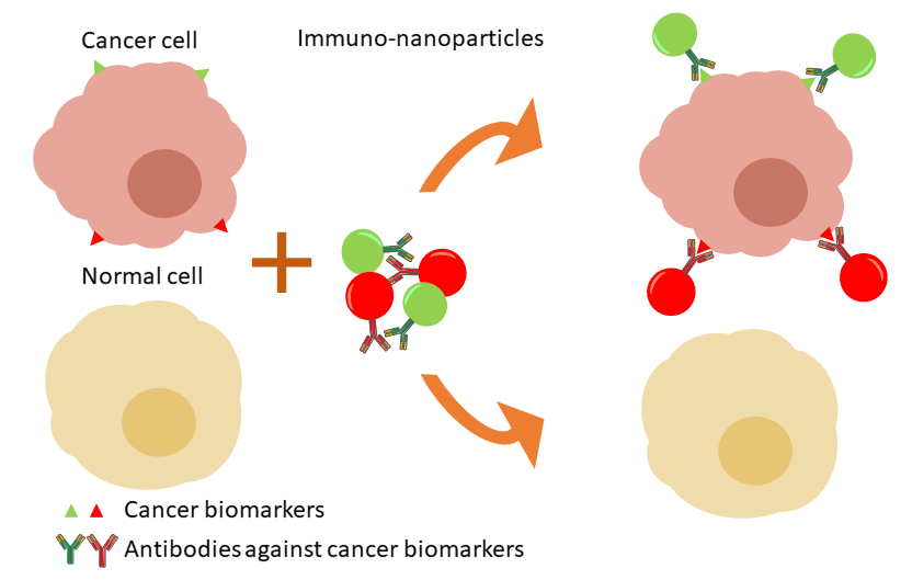 Targeting of cancer cells in tissue samples: multiple immuno-nanoparticles with specific antigens against cancer biomarkers label cancer cells. Each antibody is conjugated with different coloured luminescent nanoparticles, which allows the simultaneous detection of several biomarkers in one sample.
