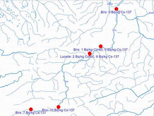 Radioactivity As expected, the radioactivity level of the sediments of the Birs tributaries was somewhat higher due to the lower water regime of these rivers. In one sediment sample from the river Lucelle (sample point No. 11), 60Co traces were detectable. This sample point is located just upstream of the confluence with the river Birs and in close proximity to Zwingen (sample point No.7), where 60Co was found in the Birs sediment. Again, the radioactivity was very low (2 Bq/kg dw) and could not be confirmed with a second analysis. Further on-site investigations did not result in any plausible source for the 60Co.