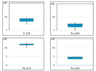 The daughters of 238U and 234U, 234Th rsp. 234mPa, were in equilibrium with their mother nuclides (the plastic material was older than 6 months). In addition, the daughters 214Bi and 214Pb were in equilibrium with 226Ra (after sealing the samples airtight for more than 20 days before analysis). 228Ra was in equilibrium with its daughter 228Ac after two days.