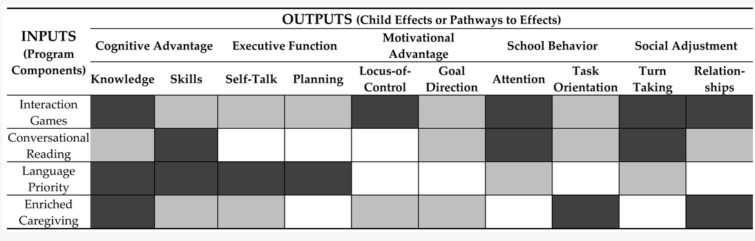 Since the Abecedarian Approach focuses on multiple strands of child development, one way to think about the Approach is to consider how the parts of the Abecedarian adult-child curriculum are intended to relate to the observed or hypothesized Abecedarian effects or outputs. Table 1 provides a summary this set of relationships in an Input-Output Map.