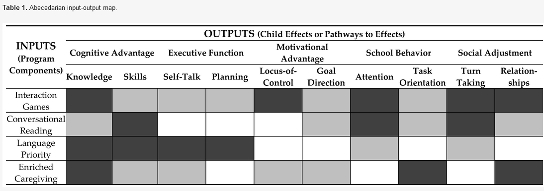 Since the Abecedarian Approach focuses on multiple strands of child development, one way to think about the Approach is to consider how the parts of the Abecedarian adult-child curriculum are intended to relate to the observed or hypothesized Abecedarian effects or outputs. Table 1 provides a summary this set of relationships in an Input-Output Map.