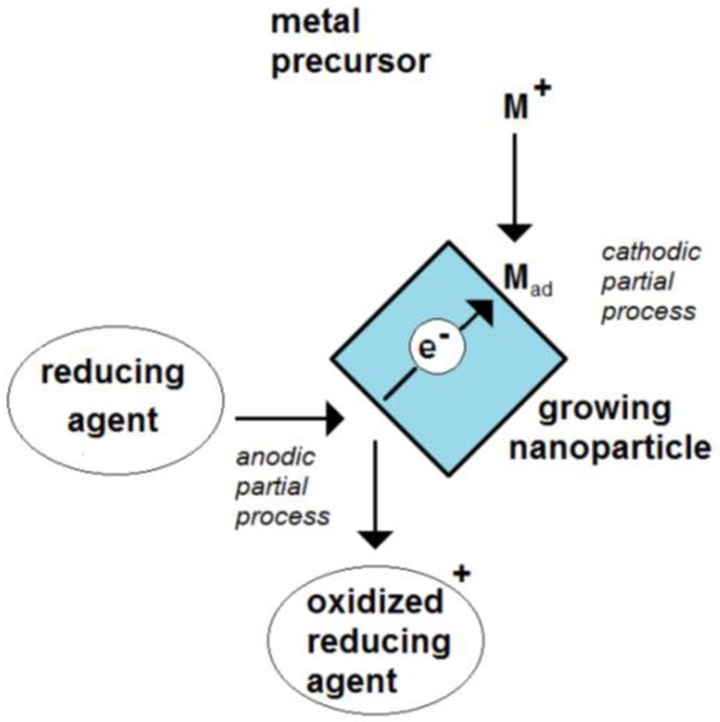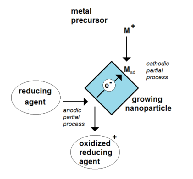The reaction system of reductive metal nanoparticle formation consists of two different object types: the ion-containing solution with the character of an electrolyte and the metallic clusters and nanoparticles. Bulk metals and metal films and metal clusters are marked by high internal charge carrier mobility. This is the essential feature of the metallic state. Together with the electrolyte, an electrode is formed.
