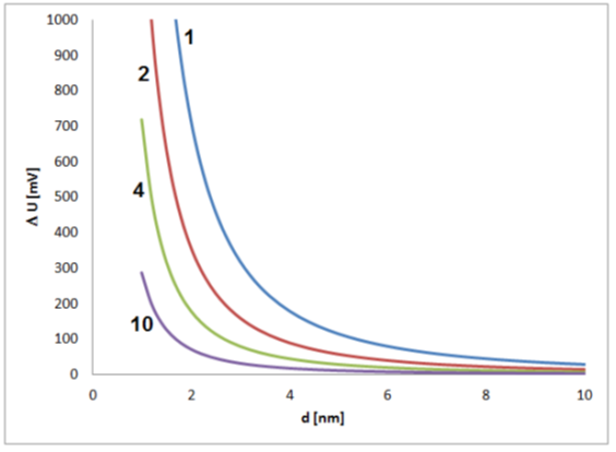 Estimated contribution of a single elementary charge on the potential of a single metal nanoparticle in dependence on the particle size for values of dielectric constant (electrical permittivity) of 1, 2, 4 and 10 and an assumed thickness of the electrochemical double layer of 0.5 nm.