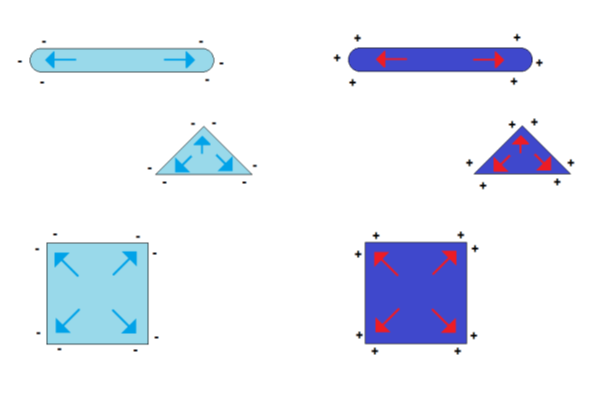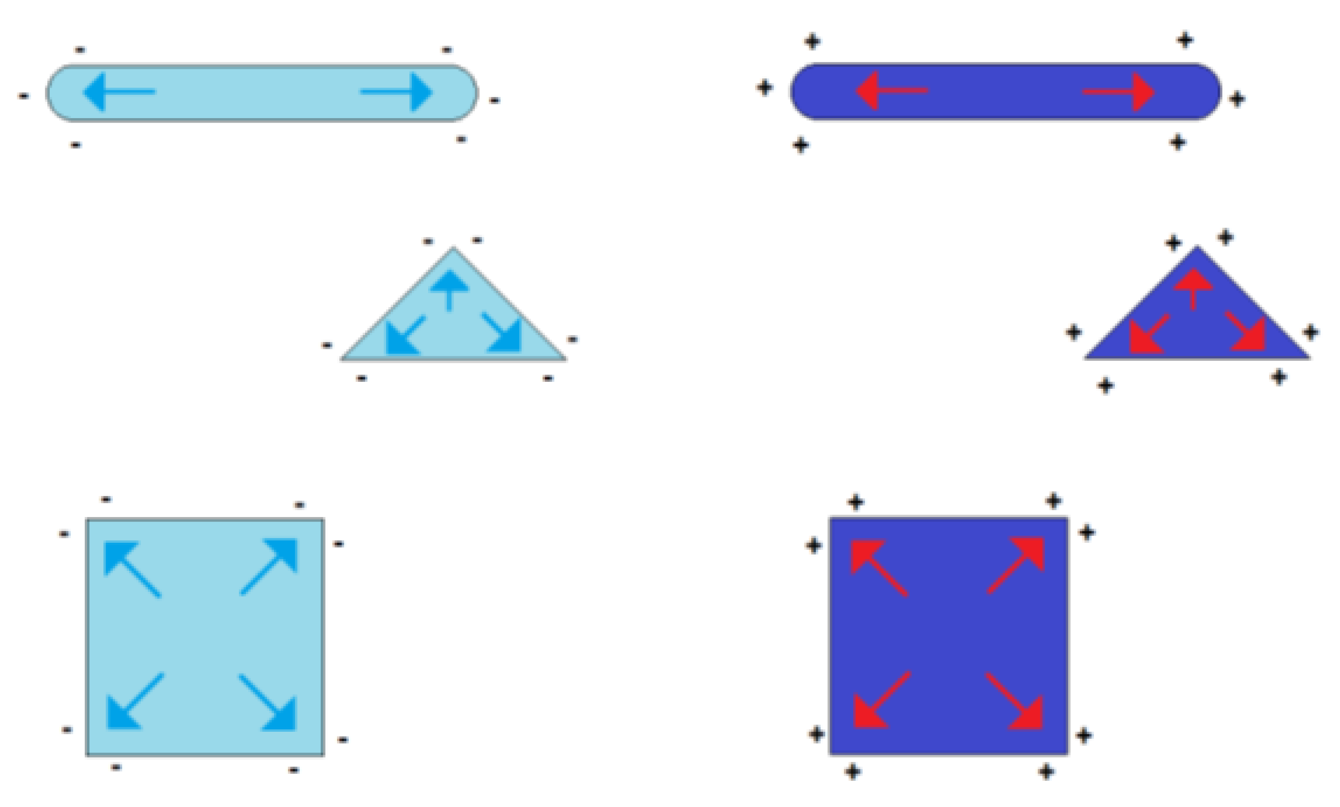 The symmetry in the charge distribution gets lost if the shape symmetry of a sphere is broken. The distribution of charges then depends on the particle shape and two or more charge centers of gravity appear. Some examples of such geometry-dependent charge distributions are shown in Figure 3.