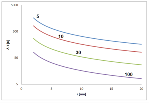 Estimated temperature differences T corresponding to the thermal energy equal to the electrostatic energy of a pair of elementary charges in distance r (for permittivity of 5, 10, 30 and 100).