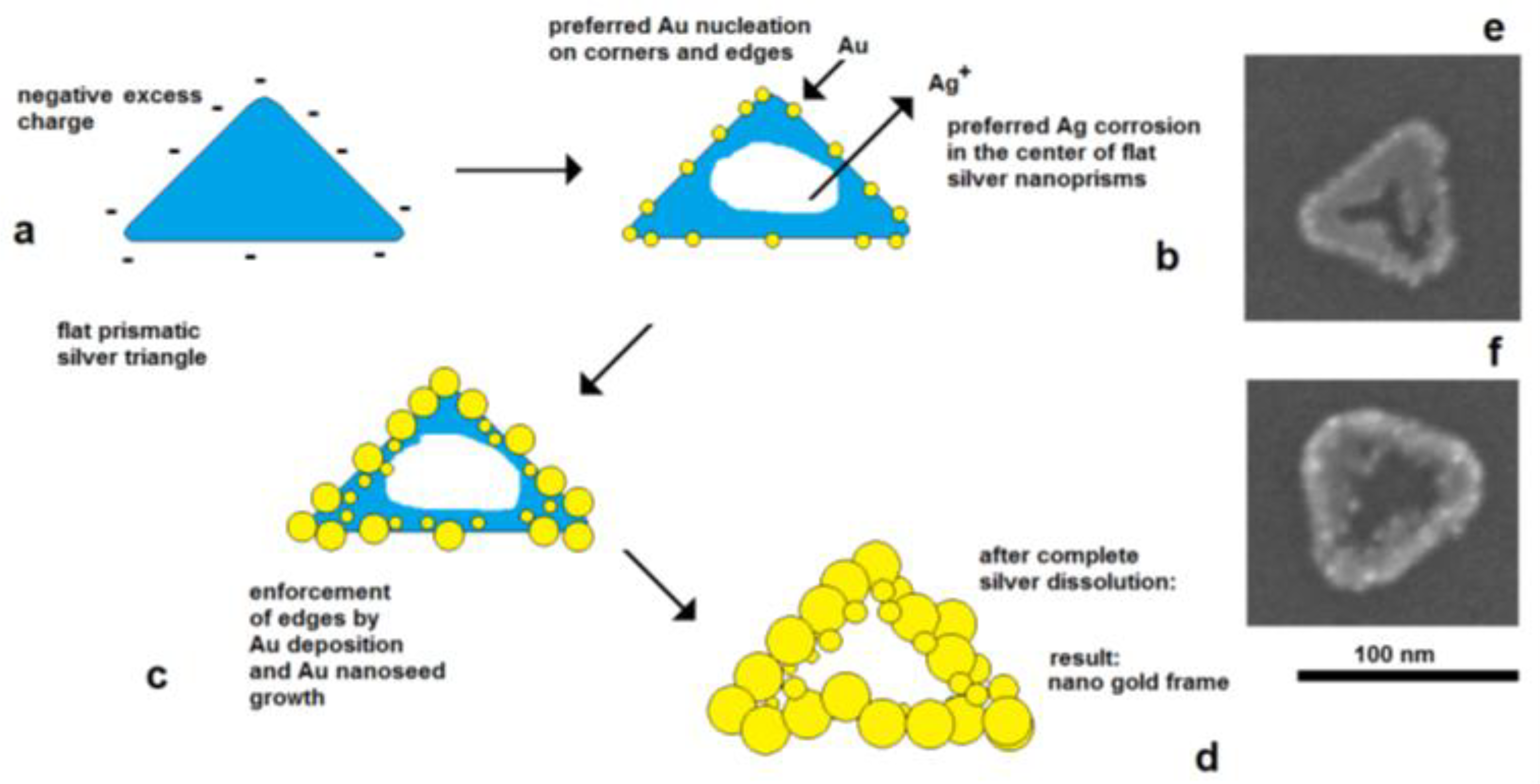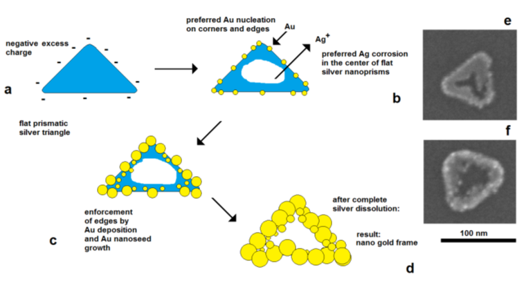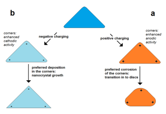 The effect of electrical control and self-polarization is well reflected by the formation of nanoframe structures by galvanic replacement reactions [36,37]. The deposition of gold on flat silver nanotriangles starts on the edges, at the preferred cathodically active sites, whereas the corrosion of silver starts in the center of the particles, at the preferred anodically active area. As a result, a central hole is formed, and the original prismatic particle shape is transformed into a frame structure (Figure 9).