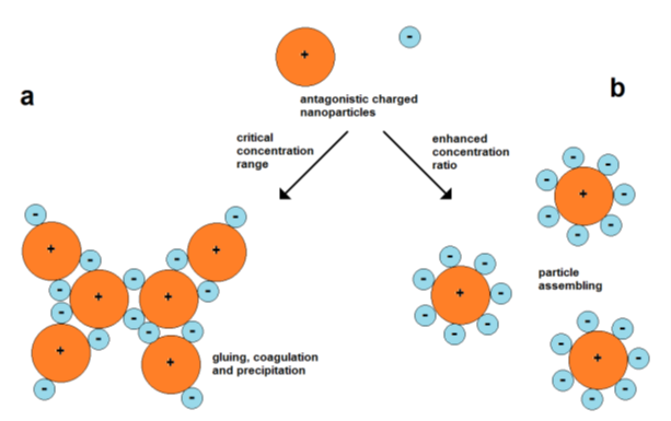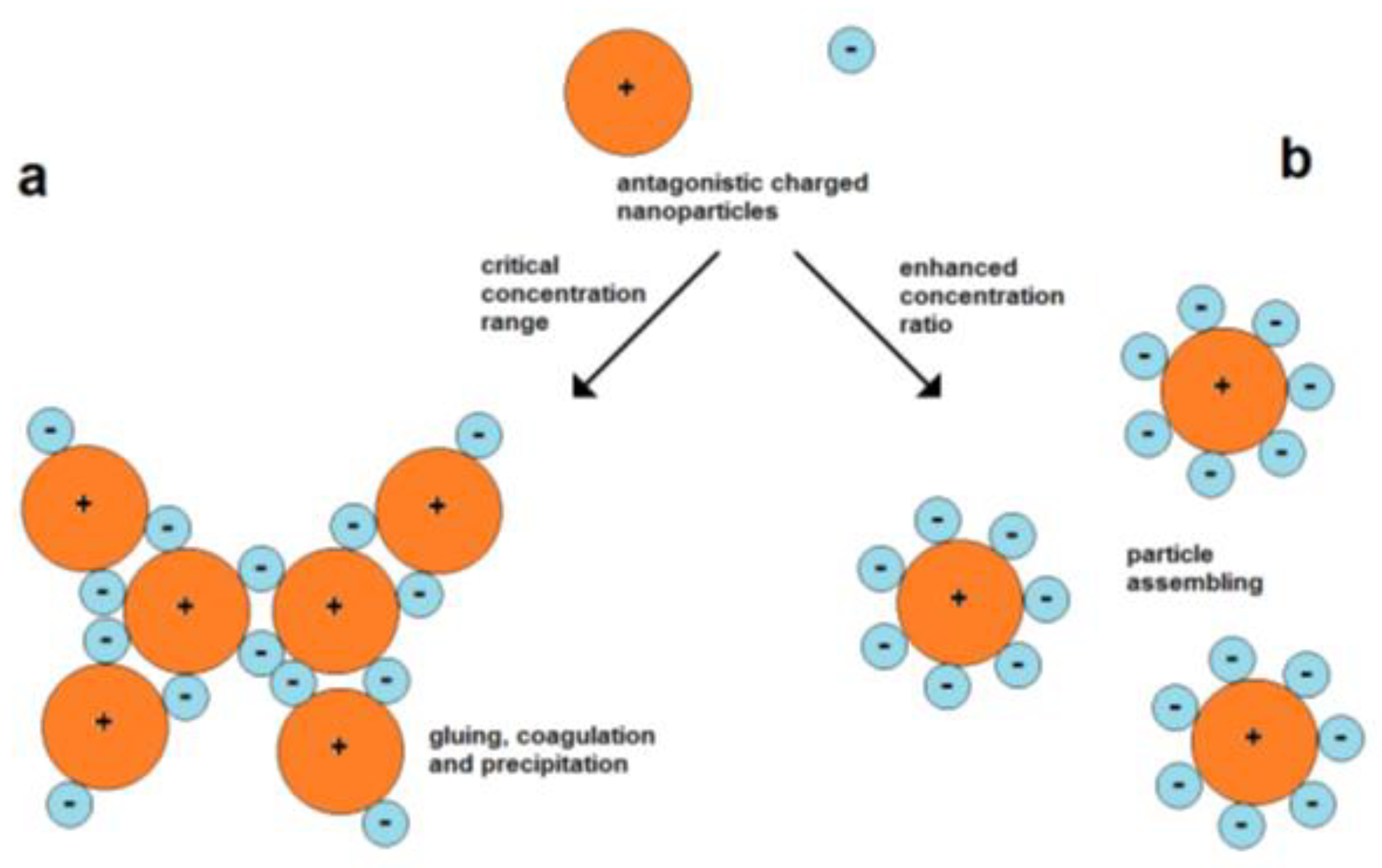 The use of attractive forces of oppositely charged nanoparticles is a simple strategy for their assembly. However, the mixing of particles of opposite charges involves the possibility of fast coagulation. A particle of one type can act as “particle glue” for connecting the particles of another type. Therefore, it is important to work with suitable particle concentrations (Figure 6).