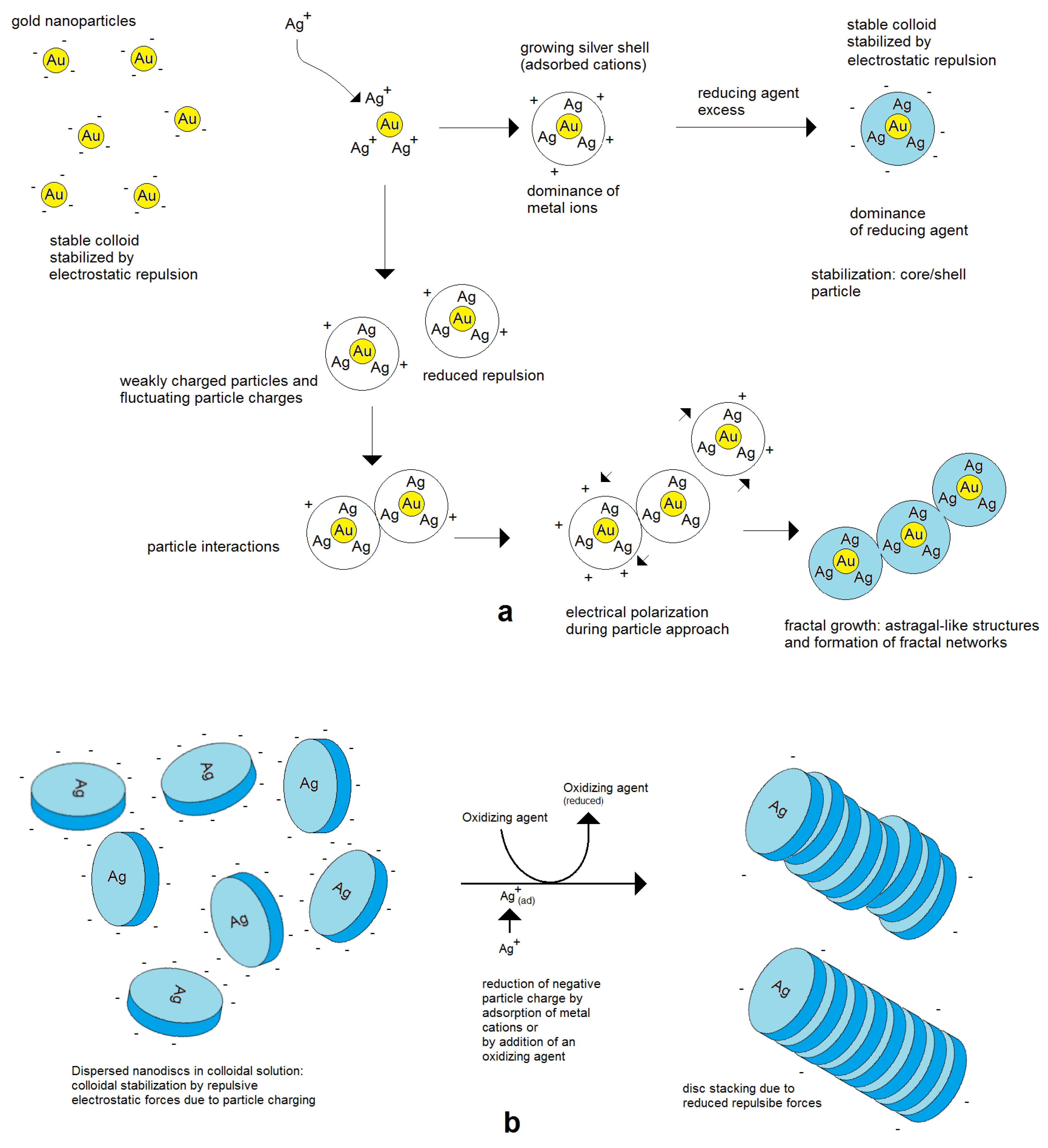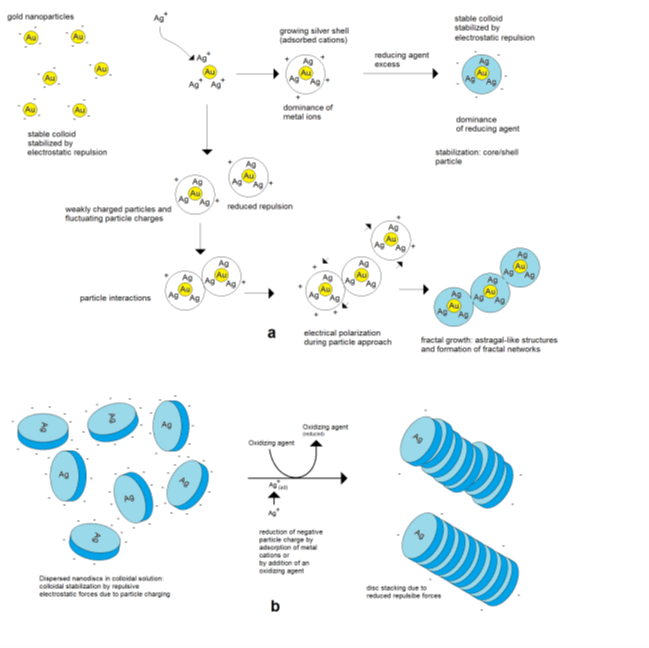 Assembly can also take place in the case of equally charged particles. Therefore, forces are needed for overcoming the barrier of electrostatic repulsion. The electrostatic repulsion of charged nanoparticles is well known for the stabilization of the colloidal state. The domination of kinetic energy and binding over repulsion leads to the aggregation of particles, which can finally result in complete coagulation and precipitation. In other cases, moderate lowering of the particle velocity while maintaining the particle charges can cause the limited assembly and restabilization of colloids. Such a mechanism can cause the formation of polycrystalline metal nanoparticles by an in situ assembly process during Au nanoparticle formation, as discovered by Polte et al. [24], and is also a probable reason for the formation of star-like Au/Ag nanoparticles [31].