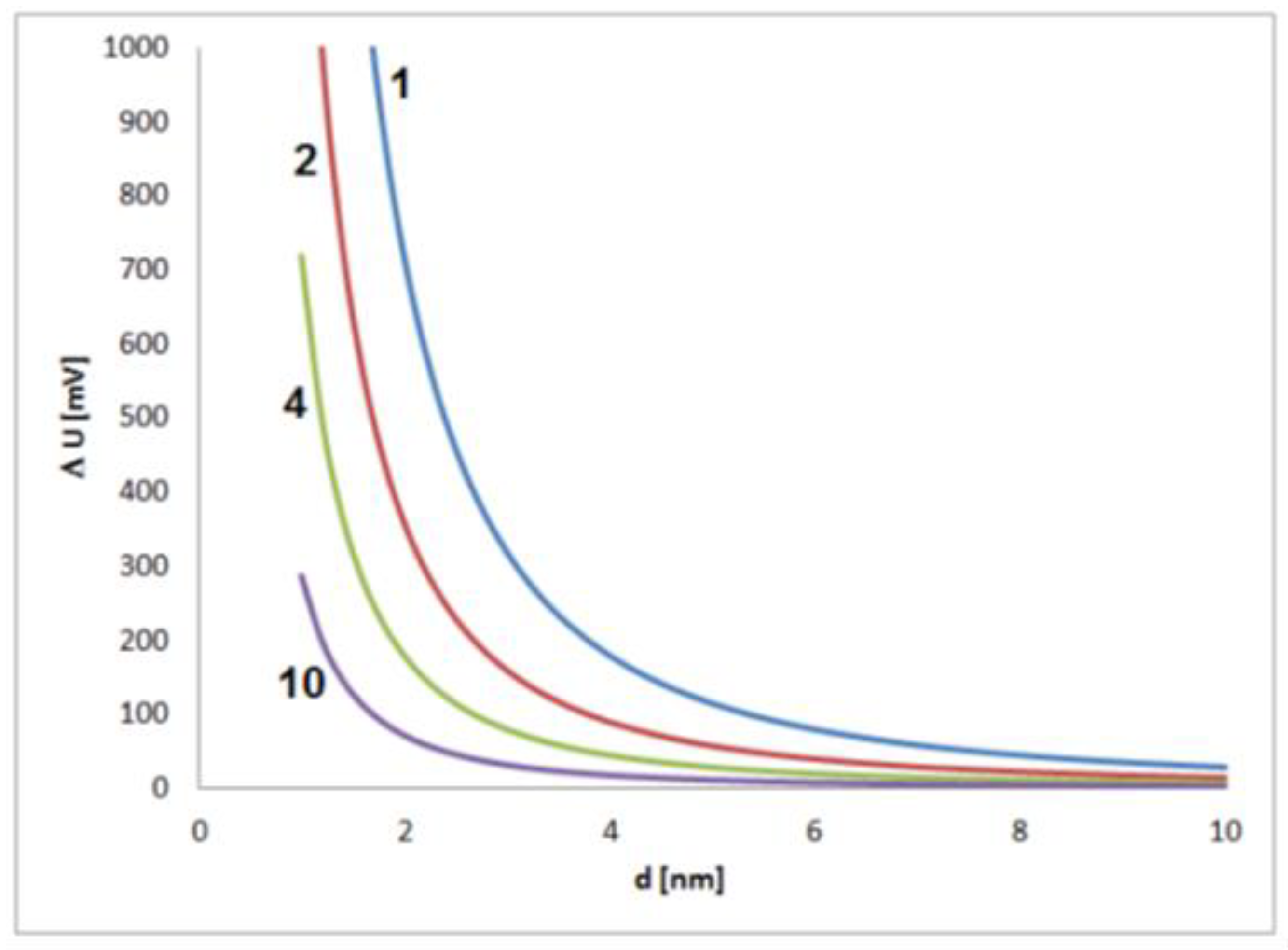 r can be approximated for the vacuum (=1), and the expected double-layer thickness is in molecular dimensions (about 0.5 nm). Then, the change of nanoparticle potential U