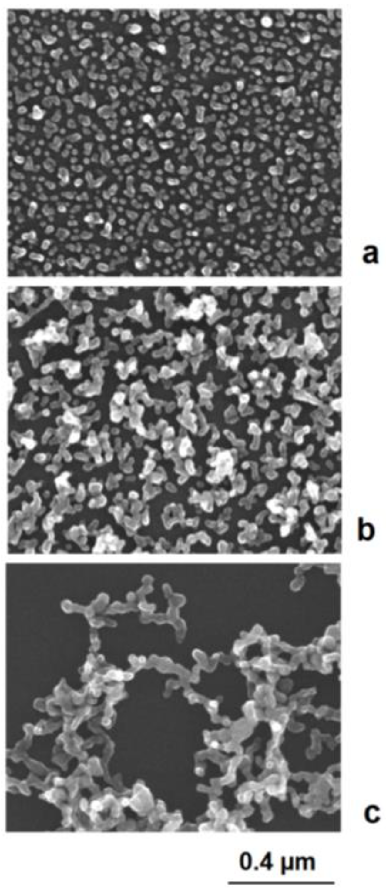 In general, higher electrical charges lead to more stable colloids and a separate growth of single nanoparticles, whereas lower electrical charges enhance the tendency of aggregation. The aggregation can end with restabilization after a few binding events after the formation of larger aggregates or networks or lead to complete coagulation and precipitation [35]. These effects can well be observed in the deposition of silver on preformed gold nanoseeds. In the case of a strong dominance of positively charged silver cations, the colloid remains stable at a higher potential. In the case of a reduced charge, particles can join each other. Due to the mobility of electrical charges, self-polarization takes place, and a preferred axial growth results in rod- and astragal-like structures (Figure 7). Therefore, not only are compact aggregates observed but also single particles. Further in situ aggregation during silver deposition can lead to branched astragal-like structures and to the formation of nanoparticle networks (examples in Figure 8).