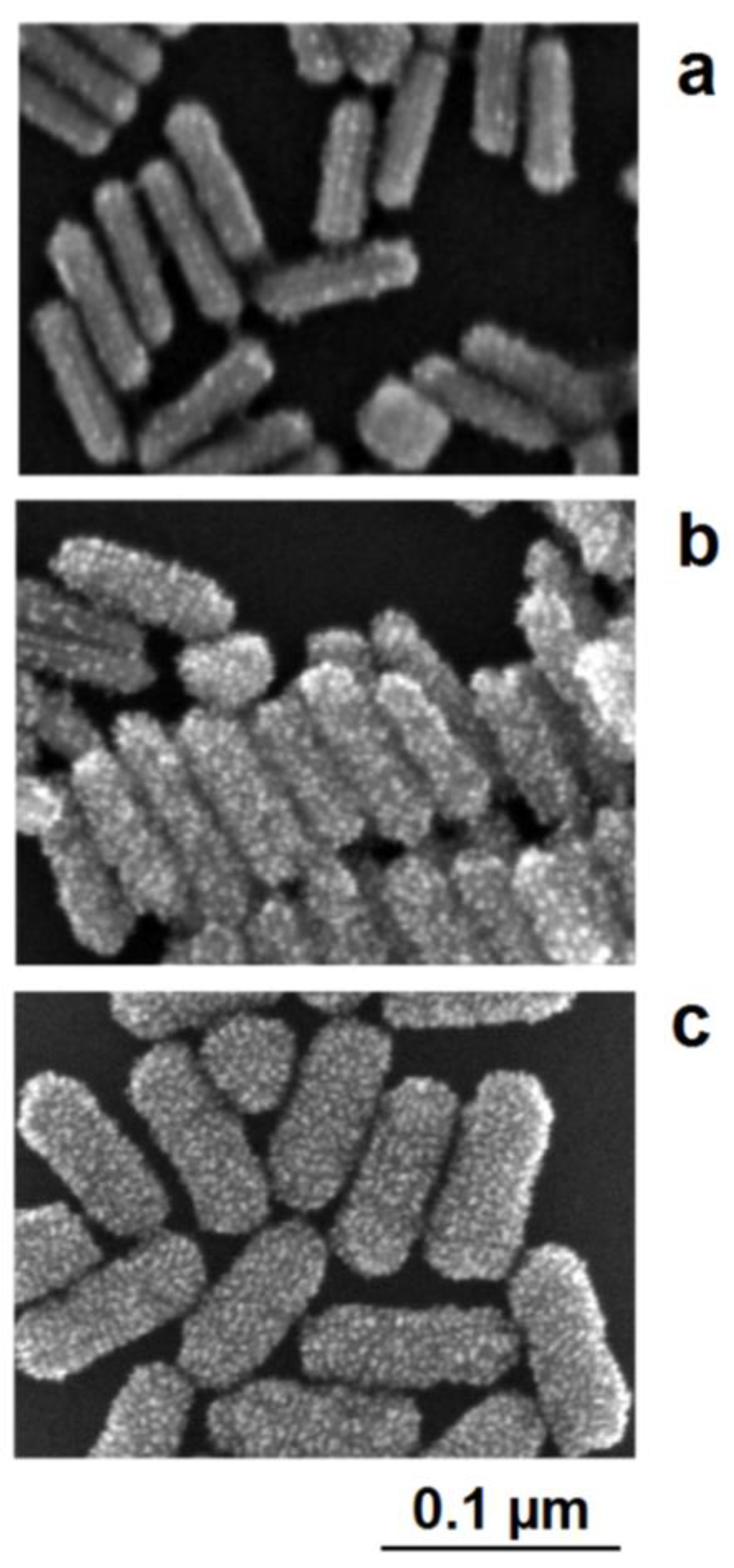 The interplay between lattice-directed metal deposition and accidental deposition can be nicely observed in the case of the formation of Au/Pt nanorods [38]. The seed-like gold nanorods are positively charged due to adsorbed cetyltrimethylammonium cations (CTAB). This charge and, therefore, the electrochemical potential of the nanoparticles, are lowered by the addition of the reducing agent, which can be oxidized on the particle surface. If a slight reduction of potential only occurs, the nucleation of platinum can only proceed on crystallographic exposed points on the gold surface. As a result, the structure of the deposited platinum nanocrystallites follows the borderlines between the crystallographic surface planes of gold nanorods. At low deposition rates, the nucleation of platinum starts on these borderlines between the crystallographic planes of the single-crystalline gold nanorods. The decoration of these crystallographic lines by the platinum crystallites is clearly visible in the SEM images (Figure 10a). At moderately enhanced platinum deposition activities (enhanced platinum precursor concentration), the nucleation of platinum also takes place on the crystallographic planes; the decoration effect of the borderlines between the planes, however, remains visible (Figure 10b). In this case, a more stochastic distribution of platinum crystallites in the shell is formed. At a higher precursor concentration, the nucleation probability generally increases, the dominance of the borderline-directed nucleation disappears, and a comparatively dense shell of platinum crystallites is formed around the gold core (Figure 10c).