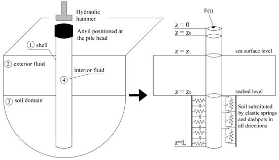Figure 3. Model proposed by Tsouvalas and Metrikine [107] to treat the pile–water–soil interaction and the generation of sound in the seawater. Inner fluid occupies the region z0≤z≤Lwhile the outer fluid domain the region z1≤z≤z2. Soil reaction to the pile is represented by distributed spring-dashpot elements attached on the pile surface at z2≤z≤L. Reprinted from Tsouvalas, A., Metrikine, A.V. A semi-analytical model for the prediction of underwater noise from offshore pile driving. Journal of Sound and Vibration 2013, 332, 3232–3257. Copyright 2013, with permission from Elsevier.