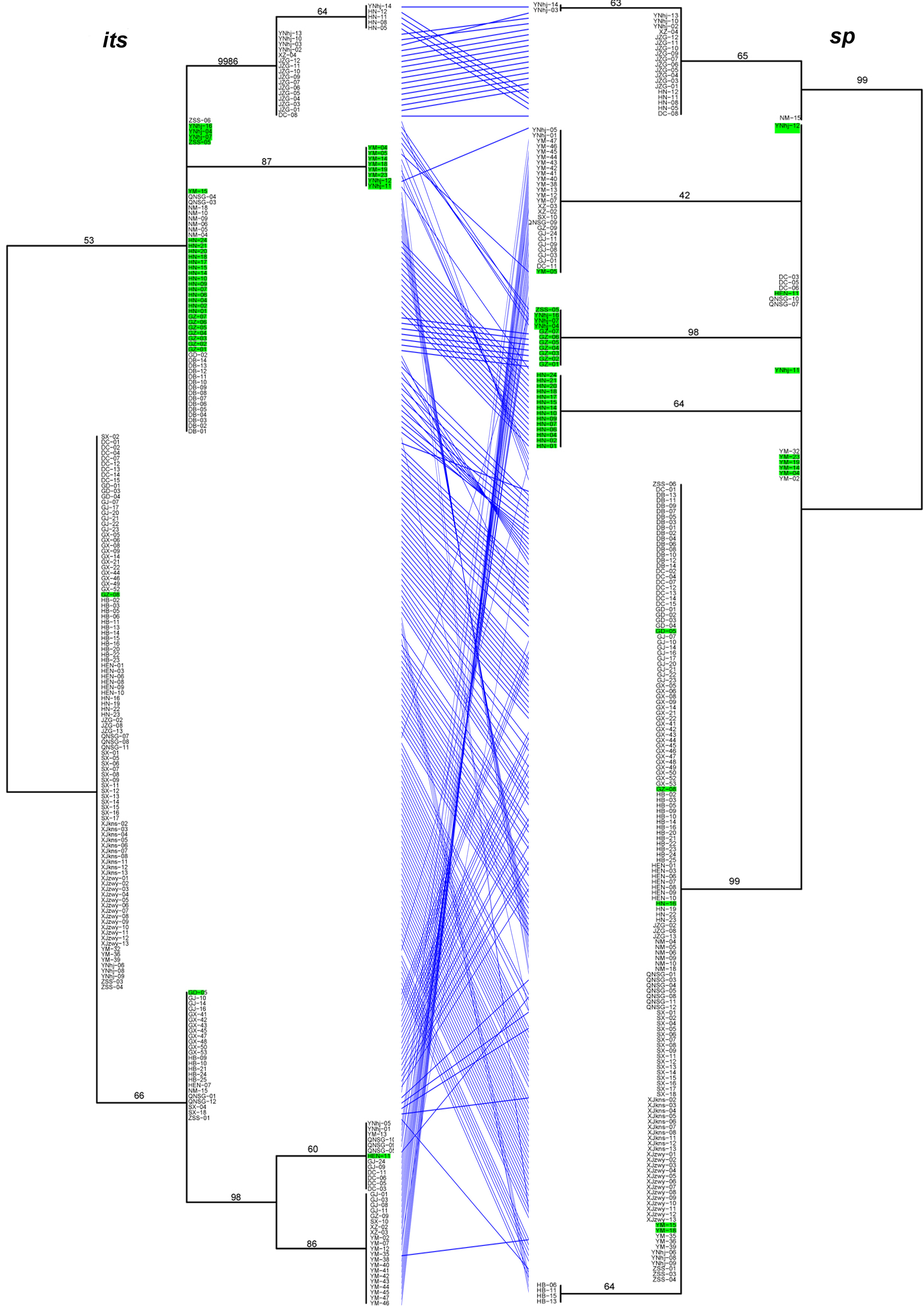 Figure 1. The tanglegram between its and sp phylogenies. Notes: Branch support values are indicated by numbers near branches, and putative hybrids (as suggested by STRUCTURE analysis) are colored in green in the tanglegram.
