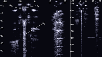 Figure 2. Two ultrasound vertical artifacts with different zoom degrees, which were obtained on the models illustrated in the left image of Figure 1, are shown. The pair of short artifacts a1 is provided by multiple reflections between the two air cylinders which limit the aperture of the trap. The longer artifact a2 is generated by the re-radiation of the acoustic energy and starts when the beam is reflected from the bottom of the trap.