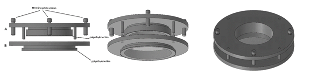 Figure 5. The figure shows a drawing of the device with the two membranes which seal the bottom of the two containers A and B and the way it is assembled.
