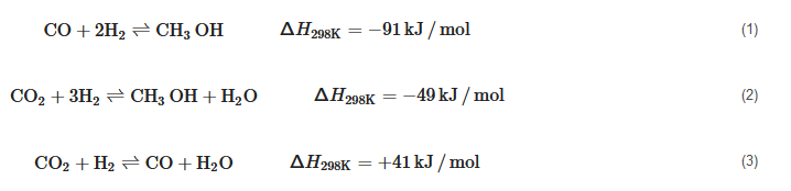 CO+2H2⇌CH3OHΔH298K=−91kJ/mol(1)