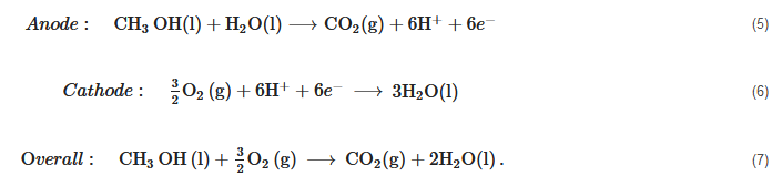Anode:CH3OH(l)+H2O(l)⟶CO2(g)+6H++6e−(5)