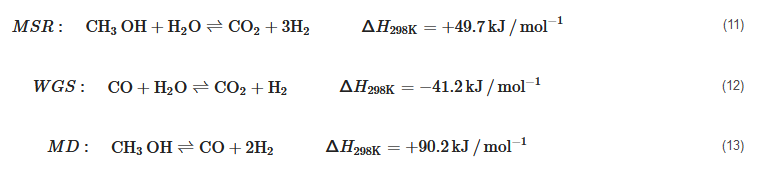 MSR:CH3OH+H2O⇌CO2+3H2ΔH298K=+49.7kJ/mol−1(11)