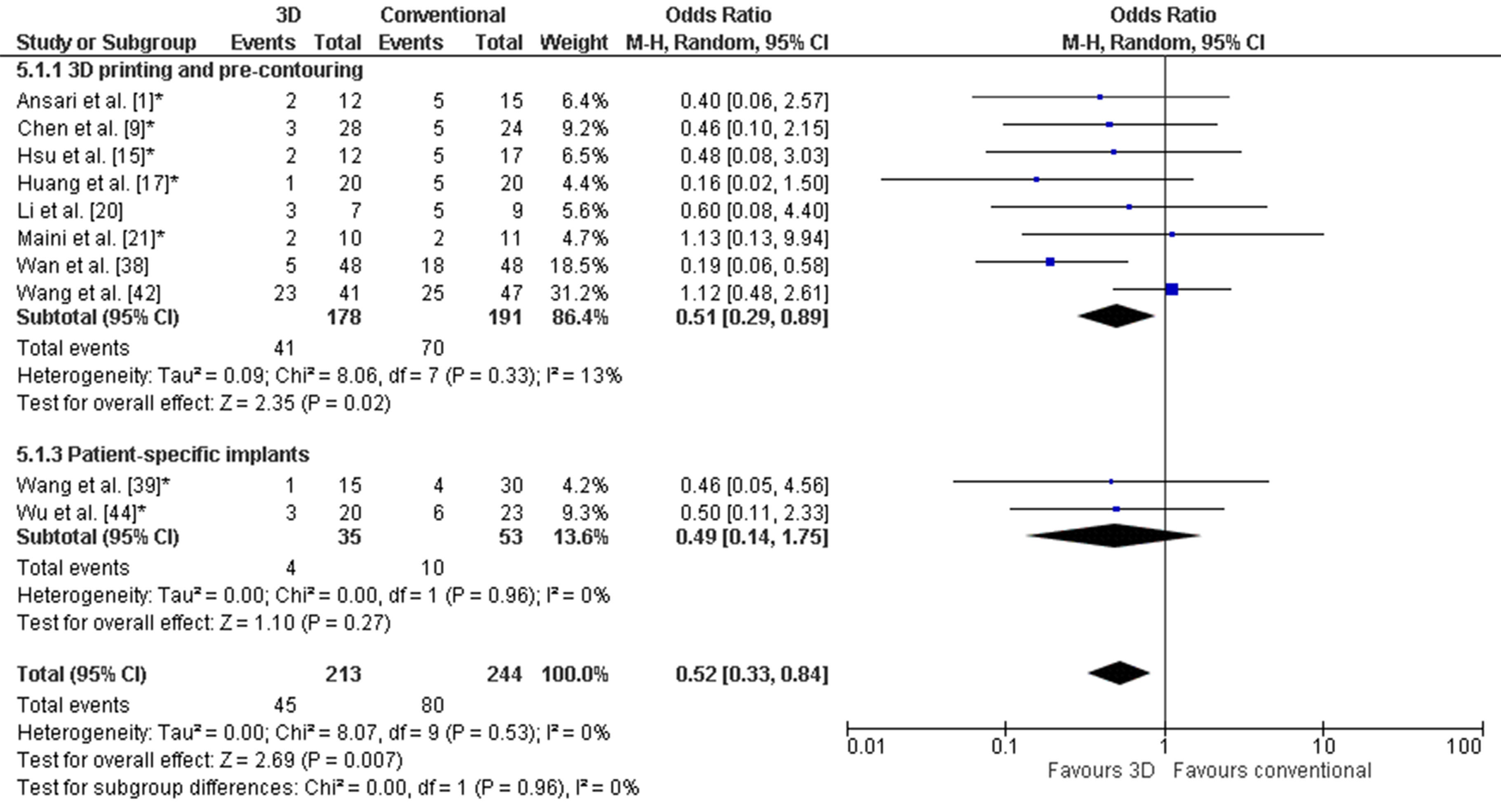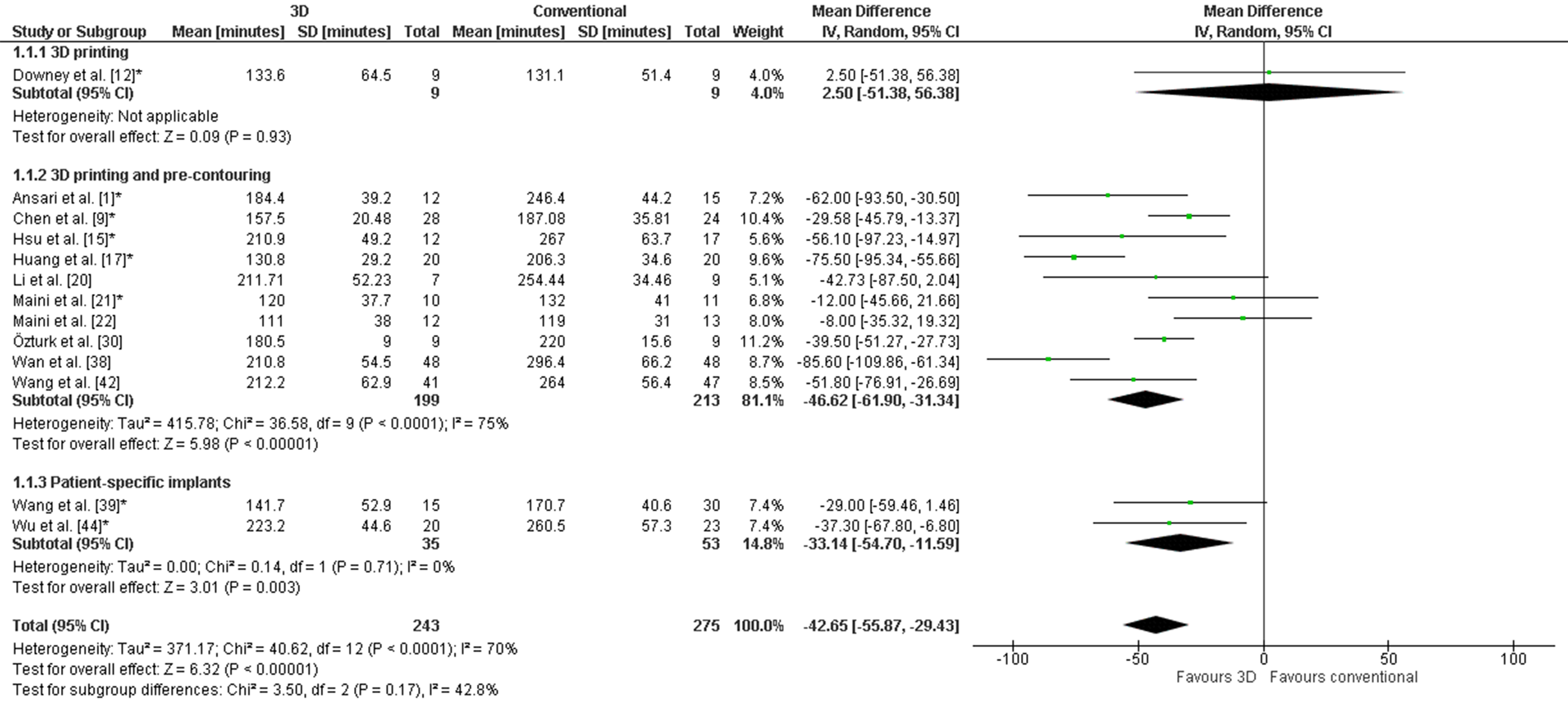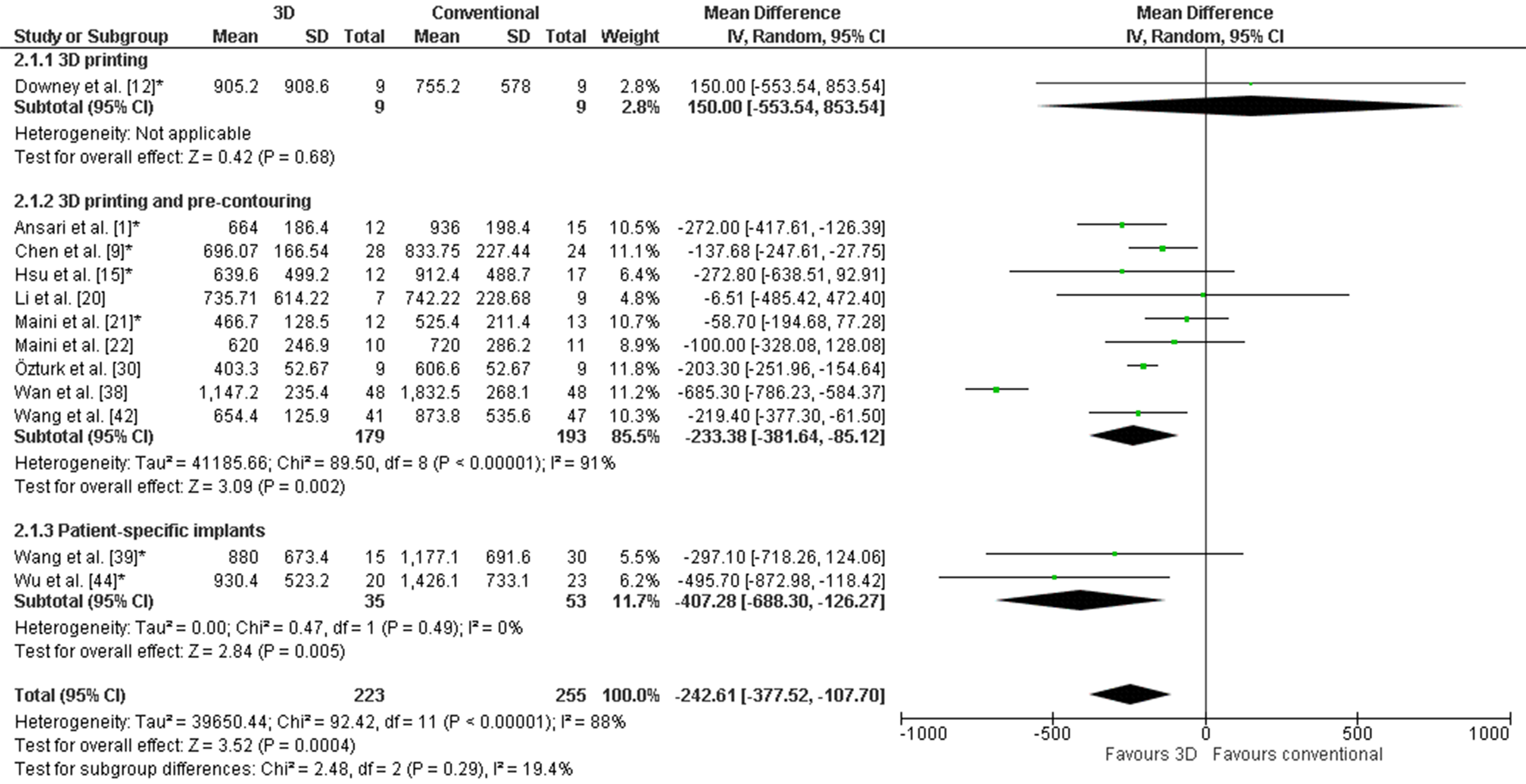 The weighted mean operation time in the 3D-assisted group and in the conventional group was 162.5 ± 79.0 min versus 296.4 ± 56.0 min. Additionally, the weighted mean blood loss of all studies was 697.9 ± 235.7 mL versus 1097.2 ± 415.5 mL. Nine out of fourteen comparative studies reported a significantly shorter operation time and less blood loss when 3D-assisted surgery was performed [30][31][32][34][38][41][45][46][47]. The operation time was 43 min shorter for the 3D-assisted group compared to the conventional group, but the heterogeneity was high (Figure 3). There was 243 mL less blood loss in the 3D-assisted group compared to the conventional group, but the heterogeneity was high (Figure 4).