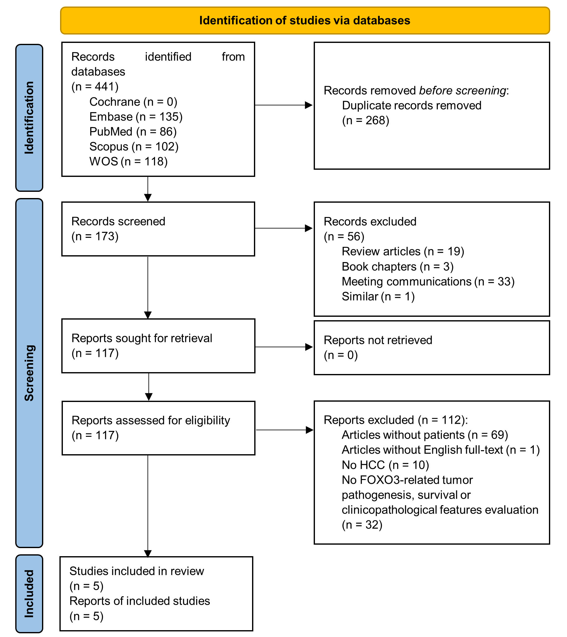 A total of 441 applicable rameters such as invasion showed an elevated heterogeneity among dataecords were identified through a database search, but 268 studies were duplicates, and after scanning titles and abstracts, another additional 56 non-original articles were excluded. The full-text of 117 articles was checked for eligibility, finding 69 articles without patient samples, one without English full-text, 10 without HCC patients and 32 without FOXO3-related tumor pathogenesis, survival or clinicopathological features evaluation. Therefore, subgroup analysithese 112 papers were also removed from the study. Finally, five articles[12][15][16][19][20] were was subsequently conducted in orssessed for quality and data extraction. All these studies reached the quality threshold according to NOS score (Table 2) and wer to inve included for quantitative meta-analysis (Figure 1).
