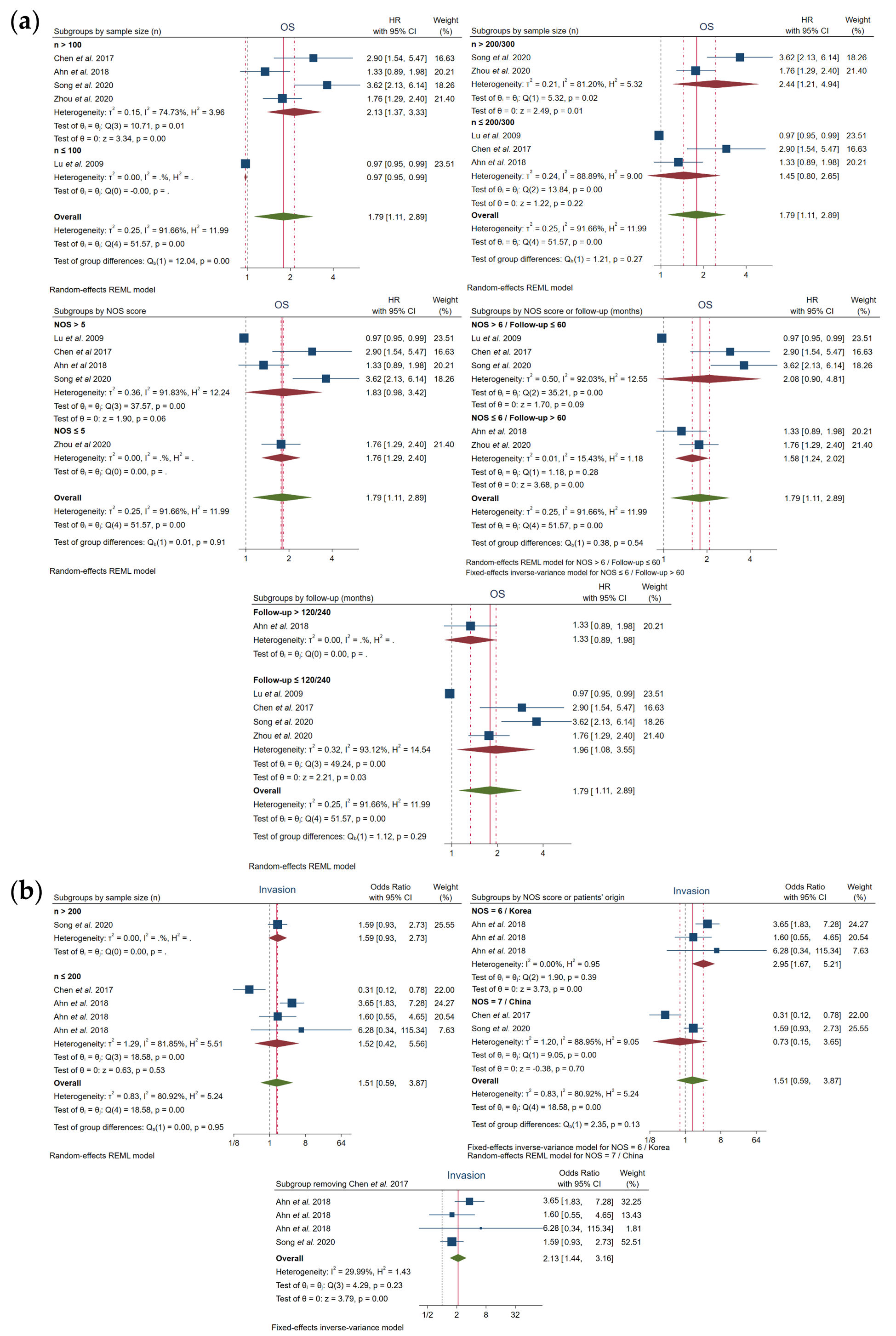 Figure 4. Forest aplso finding a significant corots after subgroup analysis of the studies assessing the relationship between high FOXO3 levels and poverexpression and (a) OS or (b) invasiorn in HCC patients. OS (Figure 3a, CI, confidence interval; HR, hazard ratio; NOS, Newcastle–Ottawa scale; OS, overall survival; REML, Restricted Maximum Likelihood.