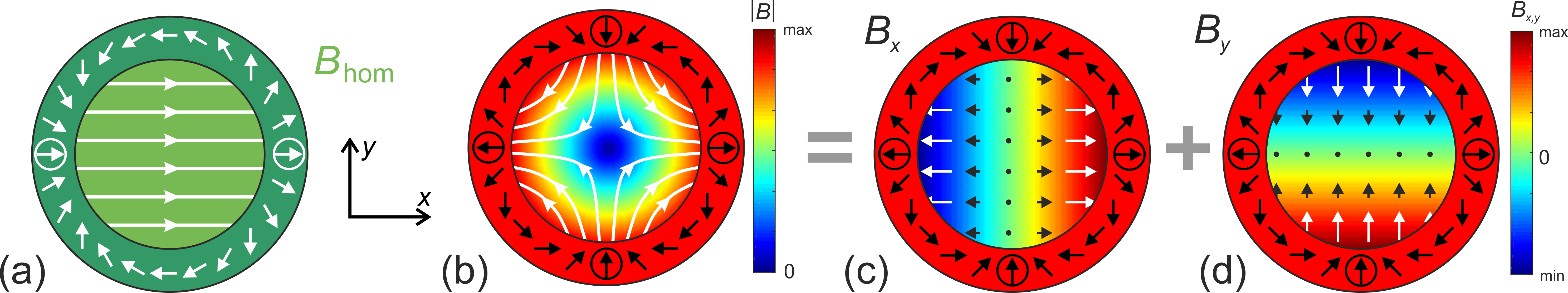 Figure 2. Sketch of ideal Halbach cylinders: (a) inner dipole with a homogeneous field of strength, Bhom along the x-axis. (b) inner quadrupole with a circular modulus field which can be decomposed into a two linear field components Bx = Gx in (c) and By = -Gy in (d). The hollow cylinders consist of permanent magnet material with continuously changing magnetization direction (arrows). The poles are encircled. In (a) and (b) the magnetic field is represented by field lines, while in (c) and (d) the arrows are field vectors (the different colors are only for better contrast). Note that the magnetic fields are only inside the hollow cylinders and that there are no stray fields.