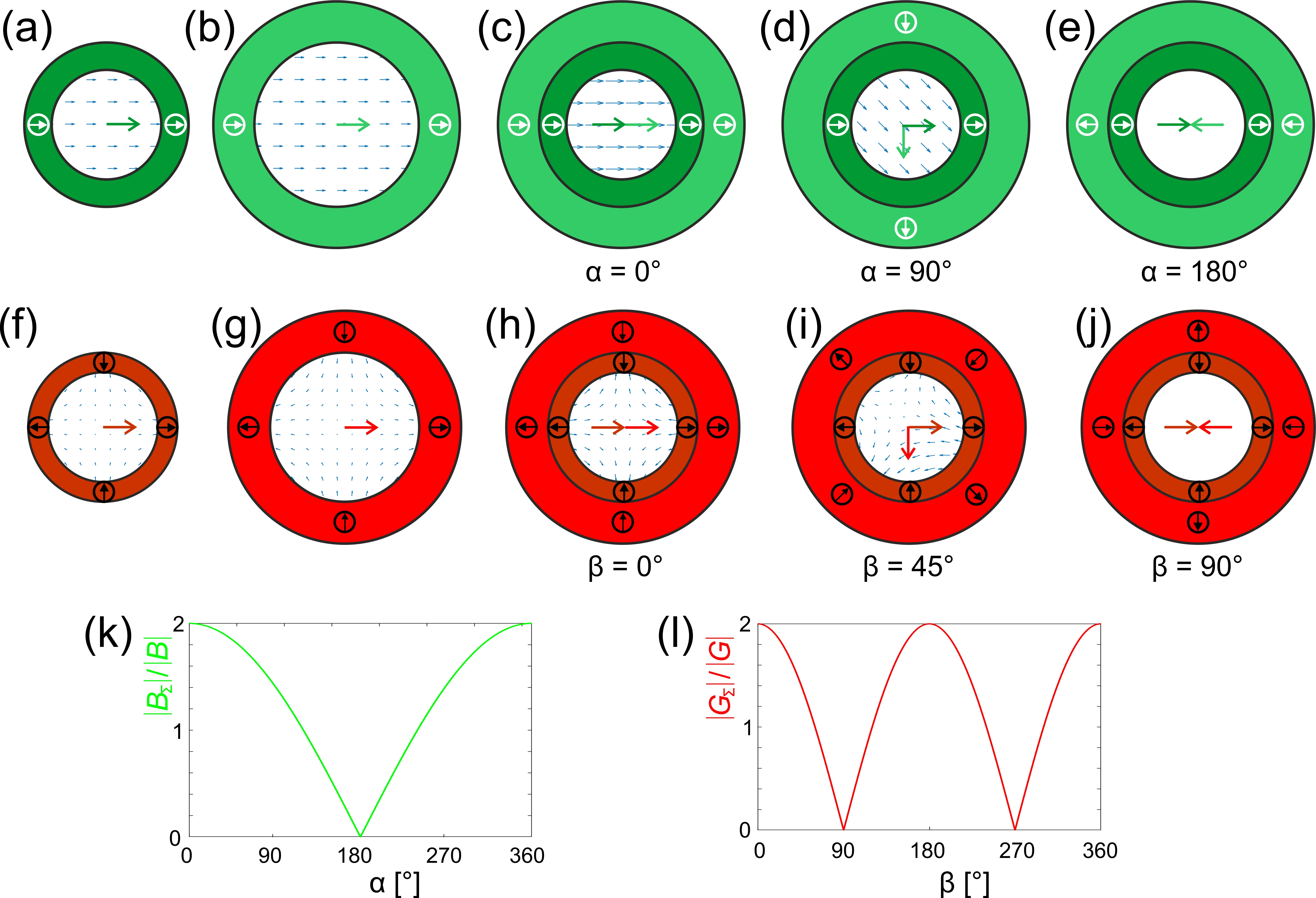 Figure 3. Coaxial arrangement and rotation of Halbach dipoles (green, upper row) and quadrupoles (red, lower row): (a) and (b) two Halbach dipoles which produce the same field strength, B (central green arrow); are coaxially nested in (c-e) and the outer one is rotated by an angle α. The resulting field is also illustrated by B-arrows. (c) For α = 0° the fields are parallel and the two dipole fields add to 2B . (d) For α = 90° the fields are orthogonal and the two dipole field vectors add to √2|B| at an angle of 45°. (e) For α = 180° the fields are antiparallel and cancel each other. An analog presentation is shown in (f-g) for two nested quadrupoles which produce the same field gradient (i.e. the derivative of the field! The red arrow shows the horizontal component only). (h-j) Same representation as above. Note that the gradient rotates at twice the angle of the quadrupole[3]. (k) The angular dependence of the combined field of both dipoles, BΣ = 2|B||cos(α/2)|, (l) Angular dependence of the gradient strength of the two quadrupoles GΣ = 2|G||cosα|.