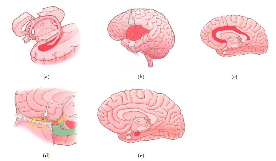 Figure 1. Regions of the limbic system affected in COVID-19 patients: (а) Hippocampus; (b) insula; (c) cingulate gyrus; (d) olfactory cortex—red-colored region represents uncus and green-colored region represents parahippocampal gyrus, red and blue lines represent olfactory pathways; (e) Amygdala (projection).