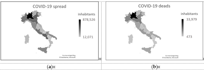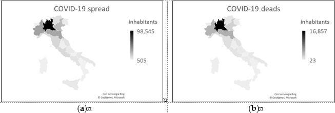 Figure 1. COVID-19 data as of 25 August 2020. (a) Number of cases. (b) Number of deaths. Both graphs show the greatest severity in northern Italy, particularly in the Lombardy region.