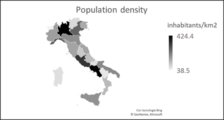 Compared to the south, the north has a higher number of inhabitants (27,746,113 vs. 20,597,424) and a greater population density (202 vs. 140 inhabitants/km2) (Figure 2). There is no doubt that, in the areas with the highest population density, the contagion is more widespread, even if protection and prevention measures are adopted.