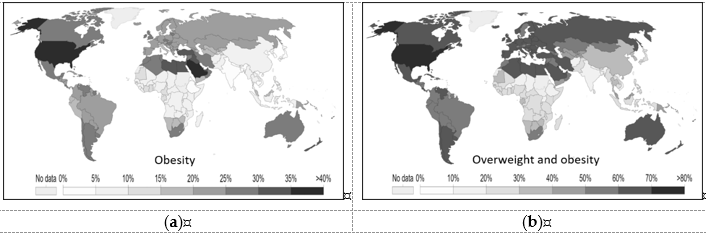 Figure 11. (a) Percentages of obese adults in various countries. (b) Percentages of overweight adults by country [37].