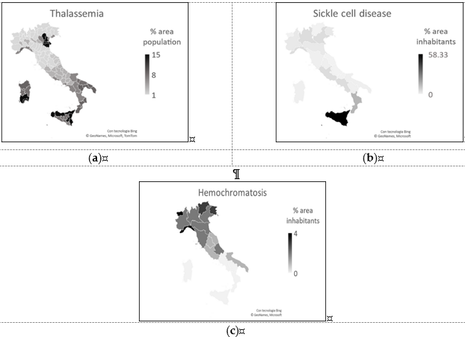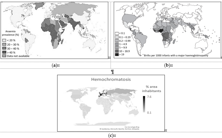 Figure 13. (a) Anemia distribution [42–44]. (b) Thalassemia distribution [45. (c) Hemochromatosis distribution [23–27,42,46].