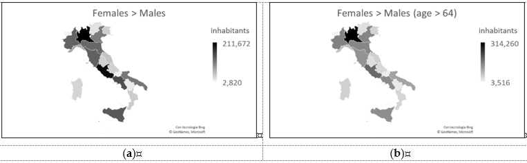 In terms of gender and age of the population, overall, there are a total of 51.6 million more males than females in the world. Up to the age of 54, there are more males than females (143.9 million). Over the age of 54, the trend reverses with 92.3 million more women than men. There are more males than females in Asia and in many North African states, considering both the overall population and the population aged > 64 [35]. People live longer in European countries, Canada, Oceania, and Japan than in African countries [33], and mean age values align with survival rates [33,35]. From this it follows that, in these countries, there are more people aged > 64 years (Figure 10).