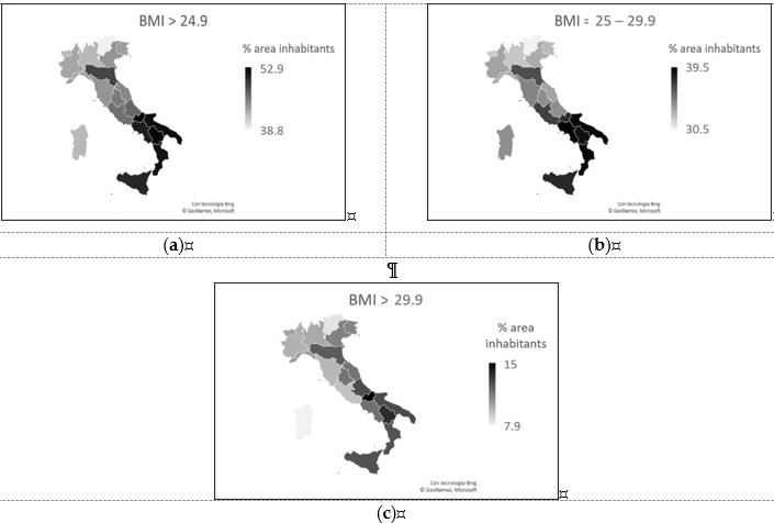 Analyzing data on the weight of the population in the world, the obesity rate is highest in the United States and Saudi Arabia. The problem of obesity is more relevant in the American states, in Europe, in Australia, and in the countries of the Mediterranean area. Problems of malnutrition, on the other hand, are more common in Africa and in the countries of South Asia [37] (Figure 11).