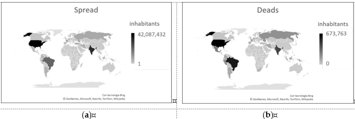 Figure 8. COVID-19 data as of 17 September 2021. (a) Number of cases. (b) Number of deaths. Both graphs show the extremely variability in the diffusion and severity of this disease.