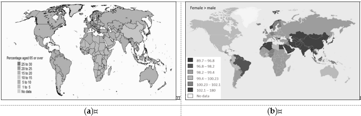 Figure 10. (a) Distribution of the World population aged > 65 as a percentage. (b) Distribution of the male and female population in the World [33].