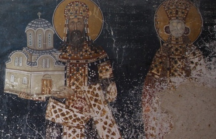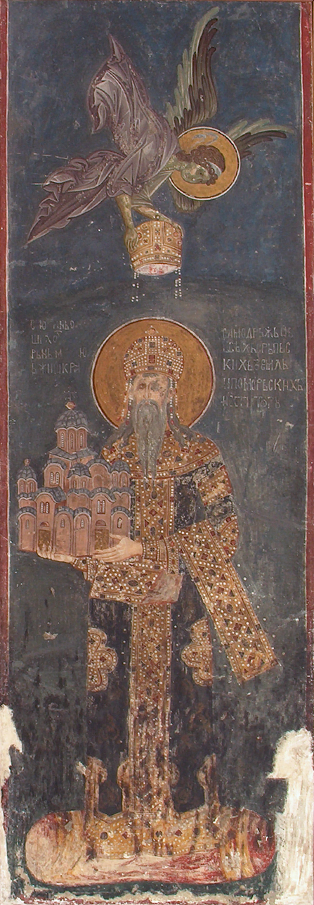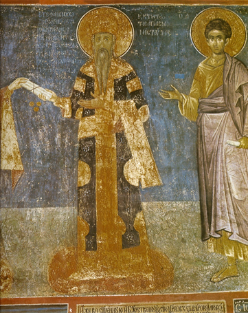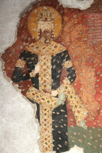 Figure 1. King Milutin, fresco, 1310–1313. Holy Virgin Ljeviška church in Prizren, north side of the east wall of the narthex, Photo Vladimir Perić. Courtesy BLAGO Fund, Inc.