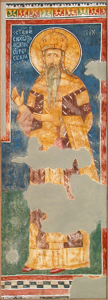by his contemporary Archbishop Danilo II, a conflict broke out between his father King Uroš I and his brother King Stefan Uroš Dragutin in 1276. King Uroš I abdicated and died less than 2 years later in the region of Hum. Six years later, following a riding accident, King Dragutin abdicated in favor of his younger brother during the council of Deževo (1282). Recently, these biographical facts were questioned by Vlada Stanković, who assumes that instead of the common belief about the reign of Dragutin from 1276 to 1282 and the subsequent first reign of Milutin till 1299, there was a “peculiar (ruling) collegium” of Kings Dragutin and Milutin, and their mother Queen Helen that lasted from the abdication of the King Uroš I in 1276 to the peace agreement with Byzantines in 1299 [1] (p. 69). Their mutual appearance proves this assumption in the fresco ensembles of the churches in monasteries of Gradac, Đurdjevi Stupovi and Arilje, as well on the two icons and the founder’s inscription of the restored Benedictine abbey of Sts. Sergius and Bacchus near Shkodër on the Boyana River [3] (p. 97).