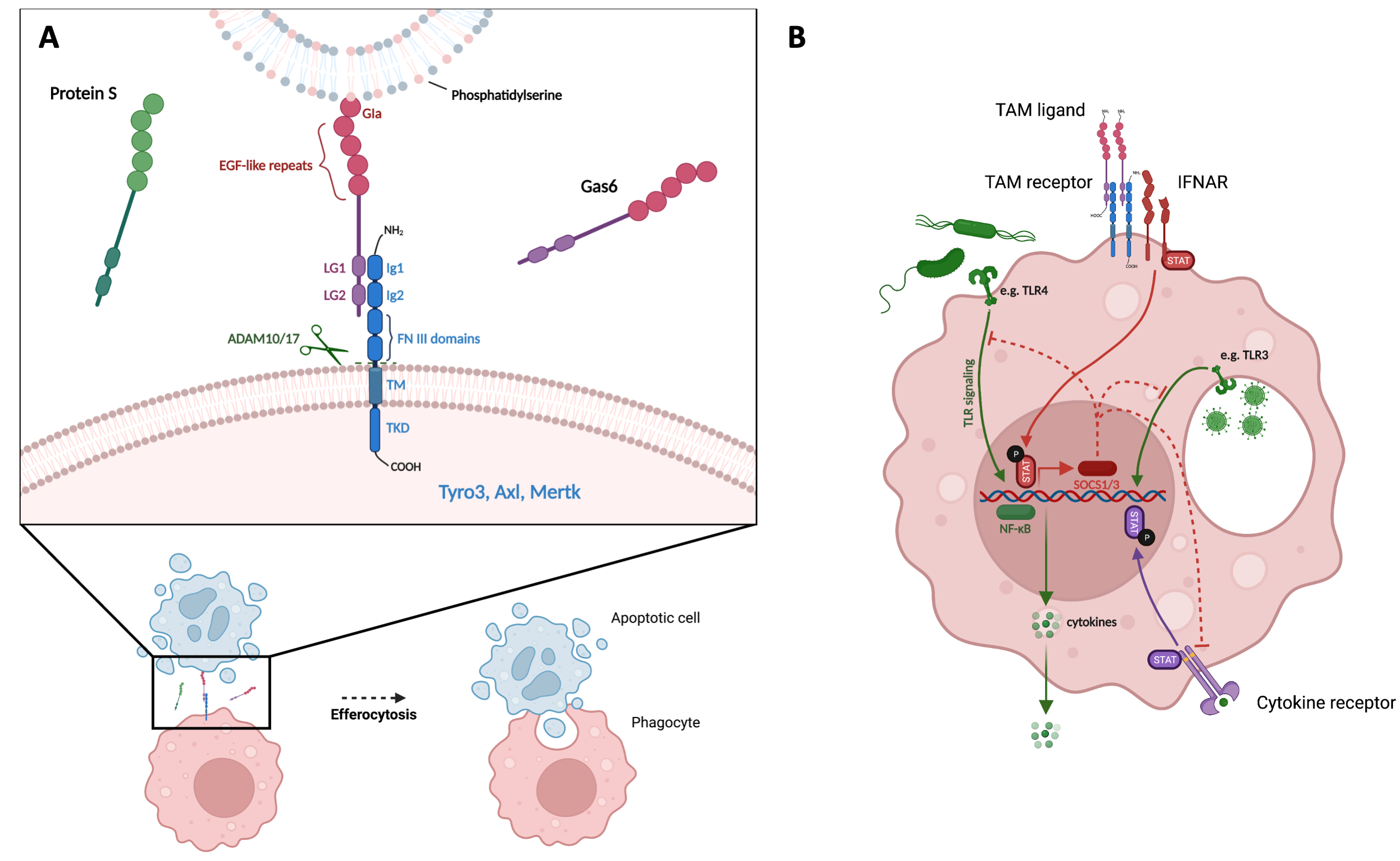 Figure 1. TAM receptors promote efferocytosis and inhibit TLR signaling. (A) TAM receptors promote efferocytosis. Illustration of TAM ligand (Gas6) serving as a bridge between PtdSer exposed on the surface of an apoptotic cell and a TAM receptor expressed by a phagocyte. Ligand G1a domain binds PtdSer on apoptotic cell; LG domains of ligand bind to Ig domains of TAM receptor; ADAM10/17 cleave TAM receptor at cleavage sites within TM domain. (B) TAM receptors inhibit TLR signaling. Illustration of TAM ligand binding and activation of TAM receptor, interaction with IFNAR/STAT complex, transcription of SOCS1/3, inhibition of TLR- and cytokine receptor-signaling pathways, and reduction in NF-κB-induced pro-inflammatory cytokine production. PtdSer = Phosphatidylserine, EGF = epidermal growth factor, LG = laminin G, Ig = immunoglobulin-like, FNIII = fibronectin type III, ADAM10/17 = A Disintegrin and metalloproteinase domain-containing protein 10/17, TM = transmembrane, TKD = tyrosine kinase domain, IFNAR = type I interferon receptor, TLR = toll-like receptor, SOCS1/3 = suppressors of cytokine signaling 1 and 3, STAT = signal transducer and activator of transcription, NF-κB = nuclear factor kappa-light-chain-enhancer of activated B cells.