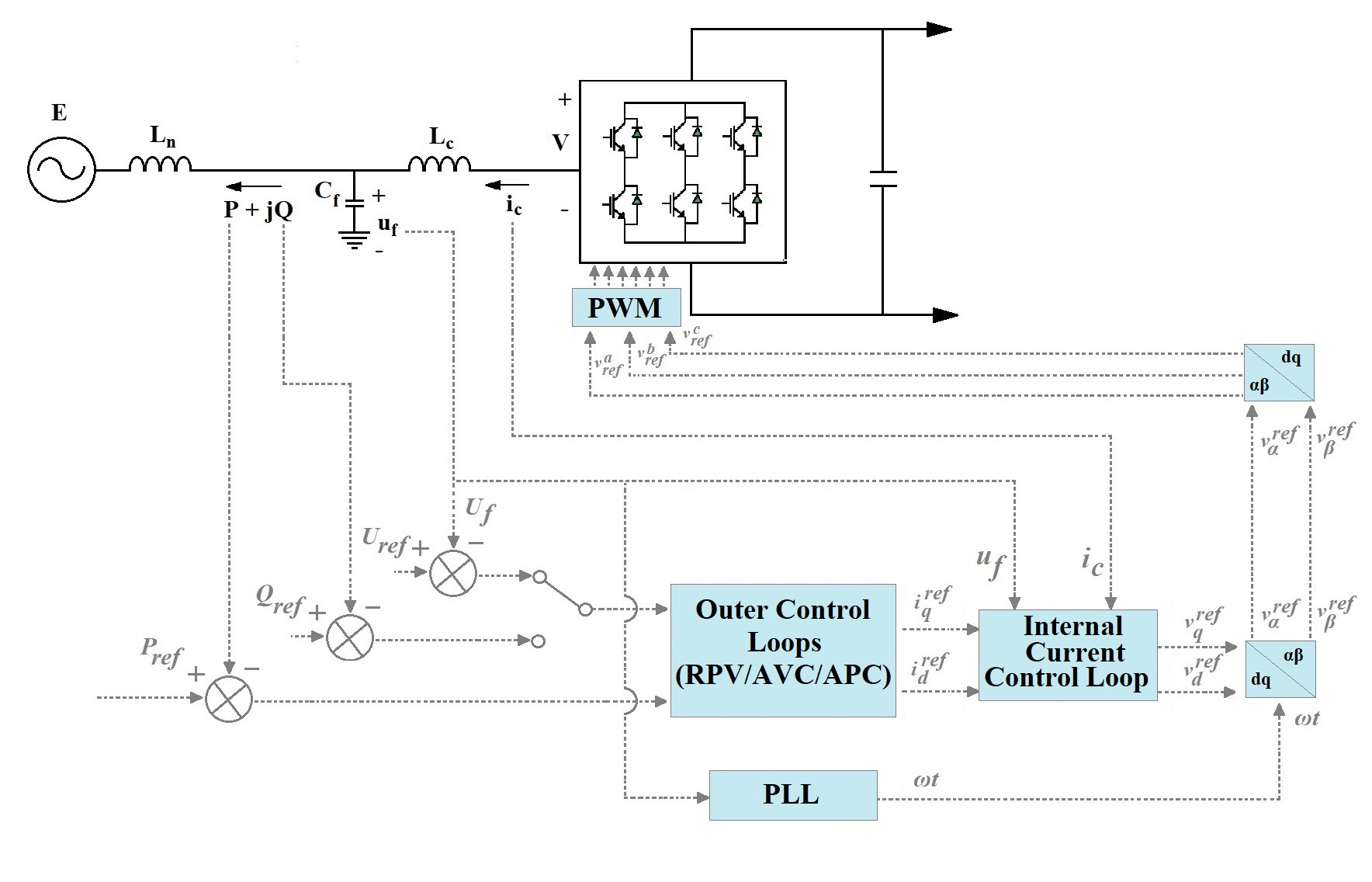 In the case of VSC-HVDC-type connections, the “vector-current” control strategy consists of the independent control of the active and reactive power by means of the following cascaded loops: external control loops and the inner current control loop.